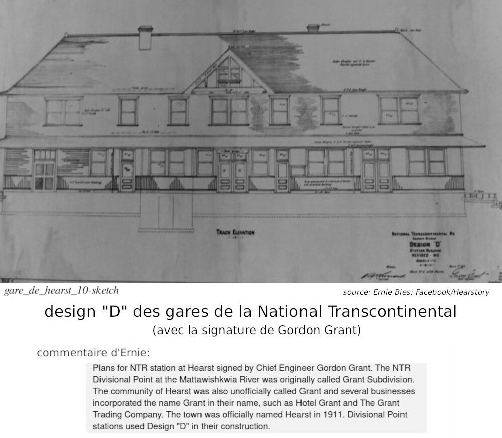 La majorité des gares de points divisionaires étaient plus imposantes que la plupart des autres gares le long du réseau ferroviaire. Le chef de gare y avait son appartement à l'étage. L'endroit était équipé pour effectuer certaines maintenance sur les locomotives, et étaient dans des localitées plus importantes. La National Transcontinental avait des plans pré-définis pour certaines gares. Dans le cas d'une gare bâtie dans un centre divisionaire, le profile "D" du type de gare était bâtie. La photo que nous avons ici nous montre un croquis du profile "D". Ce croquis est signé par l'ingénieur chef de la National Transcontinental, Gordon Grant (pour qui la plupart des centres divisionaires étaient habituellement temporairement nommé!). Un merci à Ernie Bies qui nous a fait parvenir ce croquis, via Facebook/Hearstory.