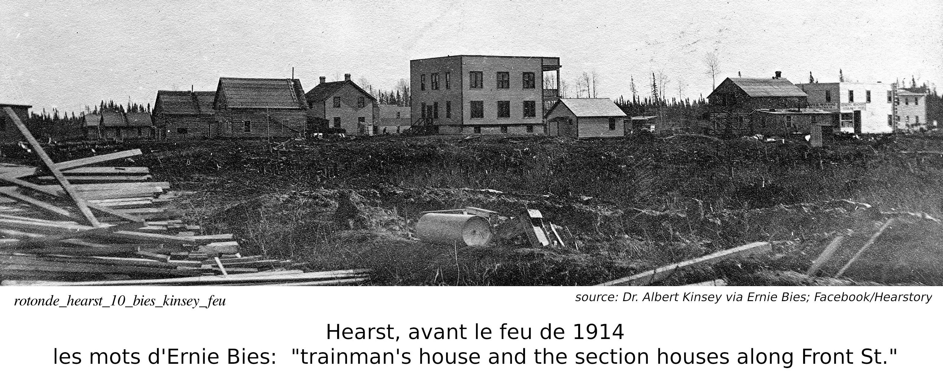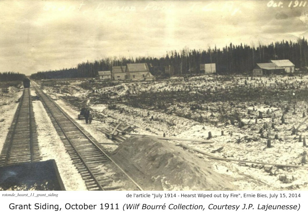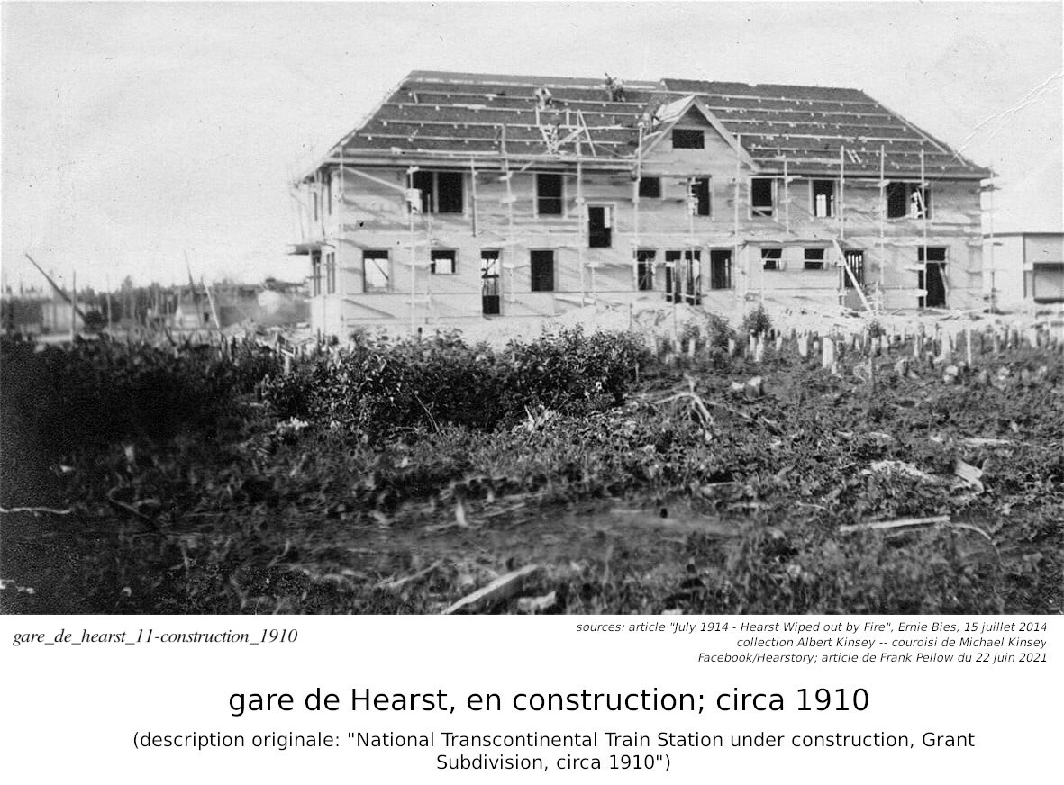 La construction semble maintenant être terminée. Mais nous y voyons les souches des arbres partout du côté sud de la gare. Plusieurs photos de la villes de Hearst datées de 1912 sont parsemées de souches. Ernie Bies en parle dans son article July 1914 - Hearst Wiped out by Fire. Il nous parle aussi des conséquences d'avoir laissé ces souches trop longtemps...
