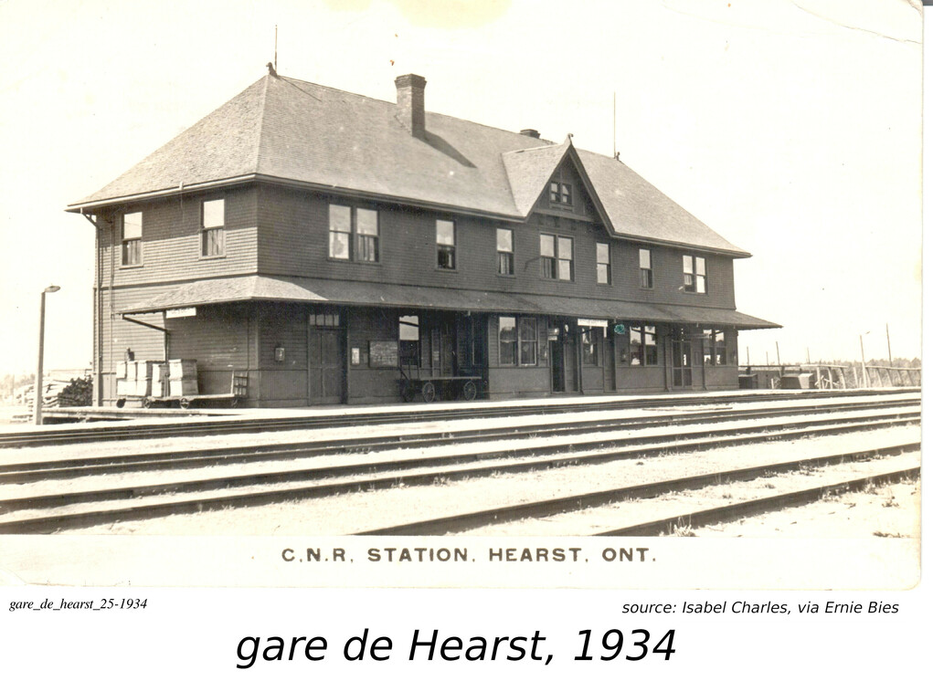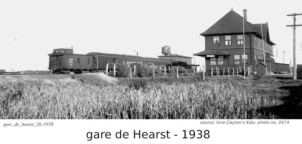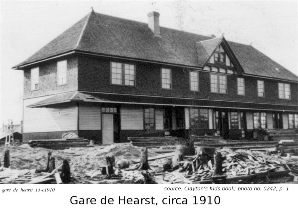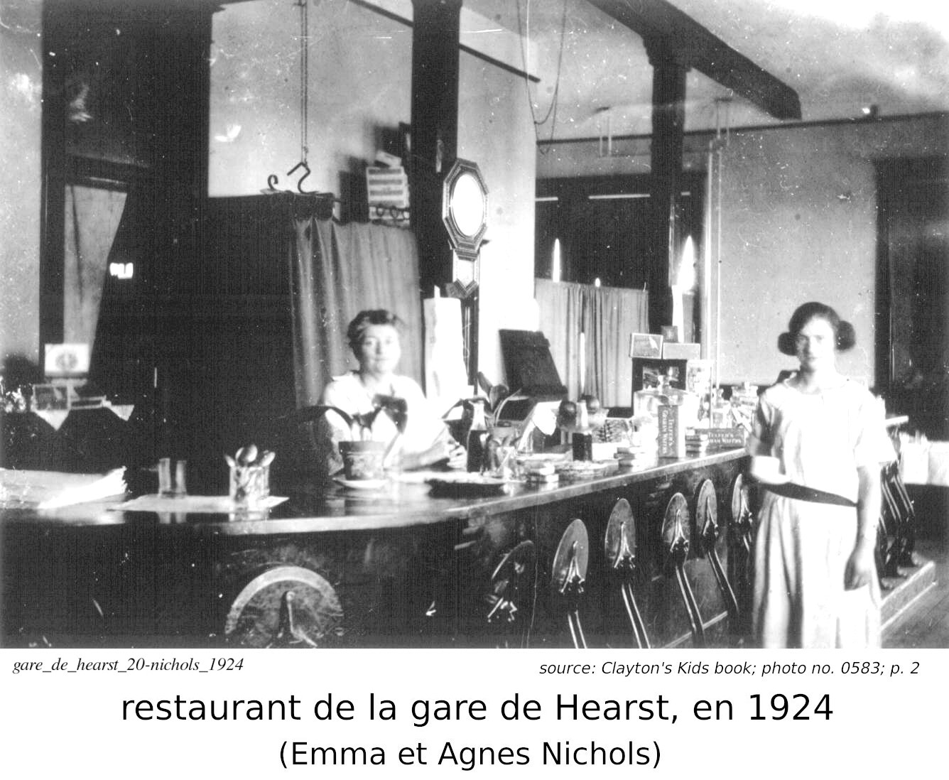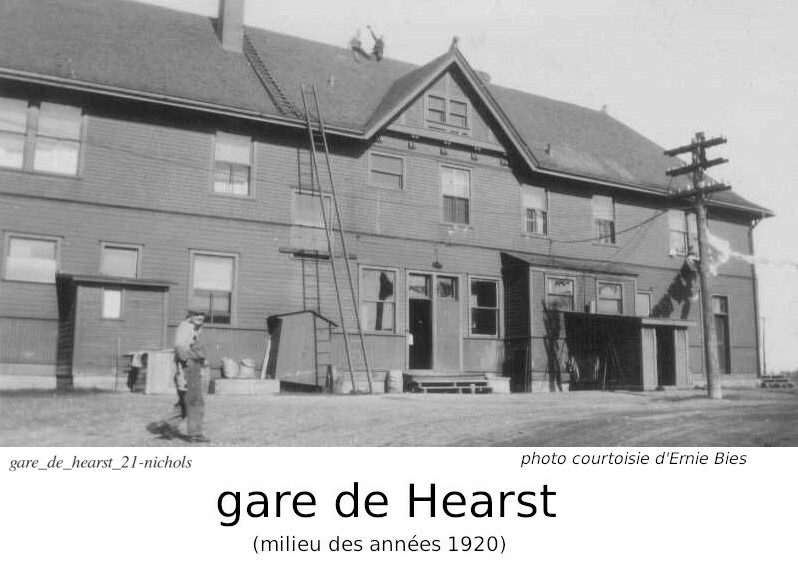 Les gares des centres divisionaires avaient un restaurant, et un bureau pour le télégramme. Le courier arrivait par train, dans cette gare. C'était le centre de la communauté de la place! Celle de Hearst était aussi un édifice moderne, avec l'eau courrante, des toilettes à eau, et la chaleur via des radiateurs! (livre Clayton's Kids, page 2). L'entrée de la famille Nichols du livre Clayton's Kids (page 237-239) nous indique aussi que, dans les années 1920, Emma Nichols gérait le restaurant de la gare. Ses filles Agnes et Queenie l'assistait. Harry, son garçon, travaillait dans l'entrepôt de marchandise, à la gare, pour le CNR. L'article nous dit qu'il y travailla jusqu'à sa retraite, à 65 ans.