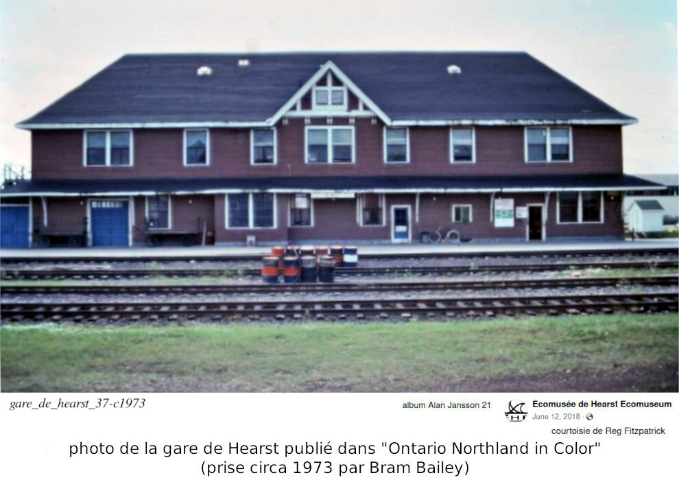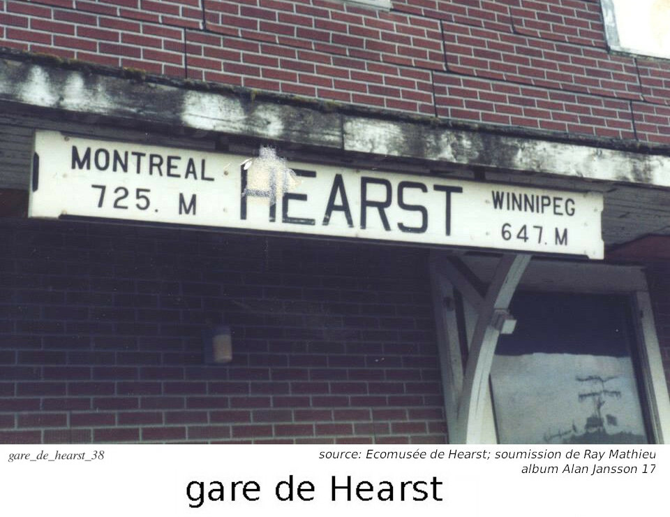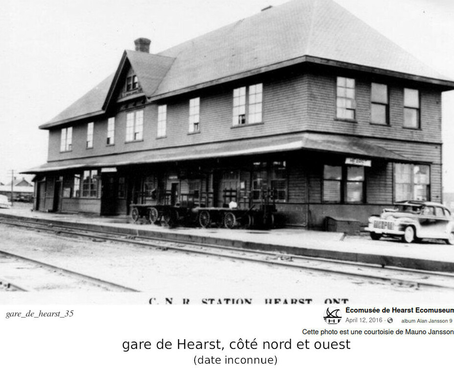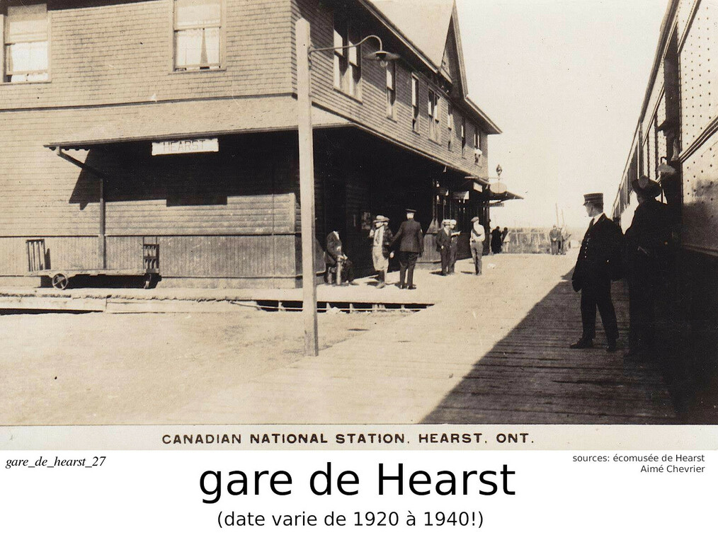Les gares des centres divisionaires avaient un restaurant, et un bureau pour le télégramme. Le courier arrivait par train, dans cette gare. C'était le centre de la communauté de la place! Celle de Hearst était aussi un édifice moderne, avec l'eau courrante, des toilettes à eau, et la chaleur via des radiateurs! (livre Clayton's Kids, page 2). L'entrée de la famille Nichols du livre Clayton's Kids (page 237-239) nous indique aussi que, dans les années 1920, Emma Nichols gérait le restaurant de la gare. Ses filles Agnes et Queenie l'assistait. Harry, son garçon, travaillait dans l'entrepôt de marchandise, à la gare, pour le CNR. L'article nous dit qu'il y travailla jusqu'à sa retraite, à 65 ans.