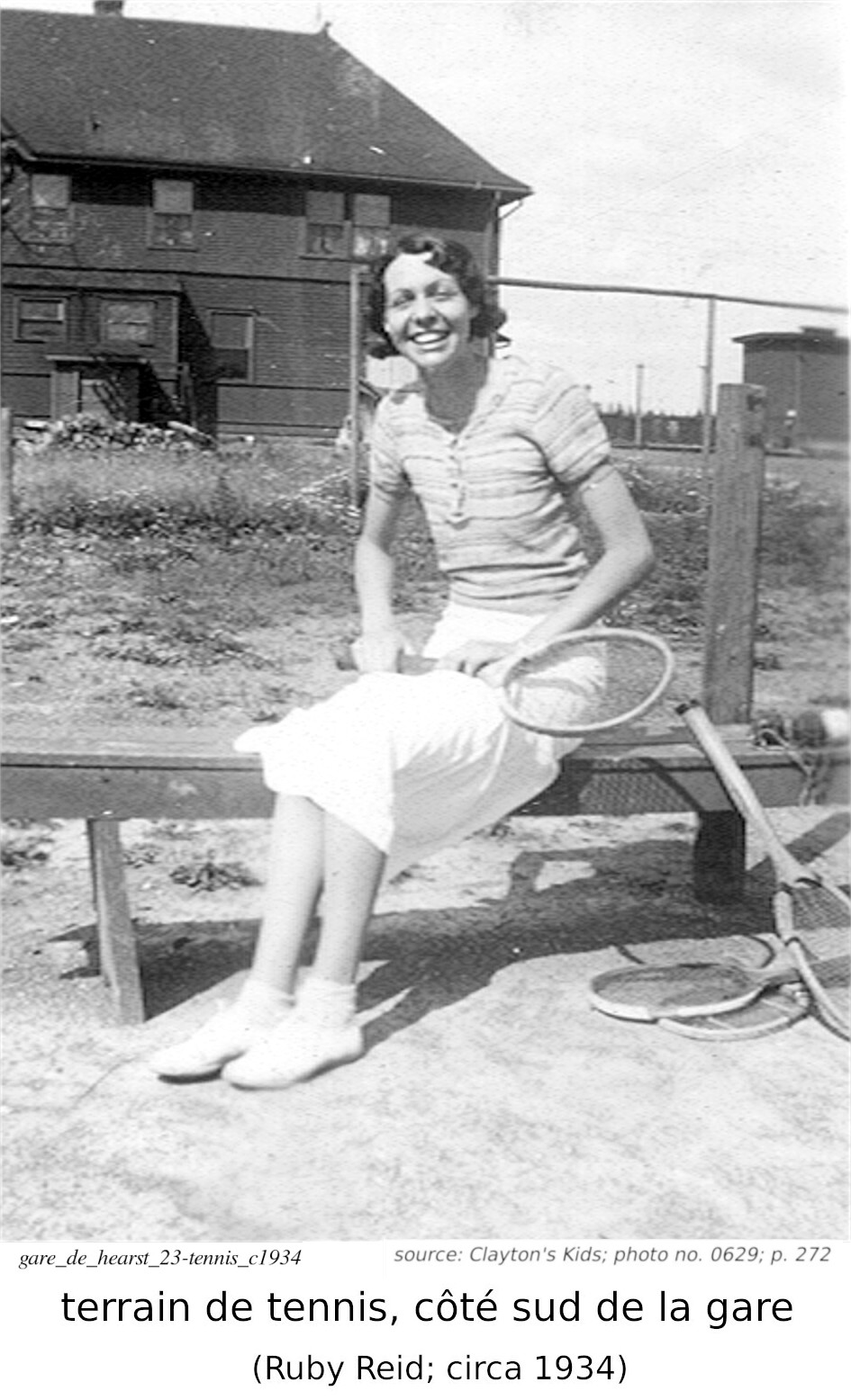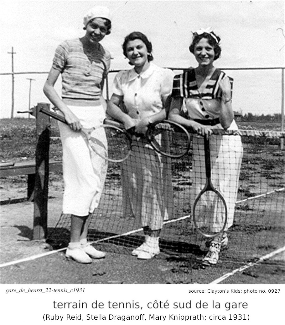 Nous avons mentionnés que la gare était en sorte le centre de la communauté. En face de la gare, donc côté sud, se trouvait un terrain de tennis. Les deux photos nous montrent des demoiselles particpant à ce sport, sur ce terrain. Nous y voyons trois personnages, Ruby Reid, Stella Draganoff, et Mary Knipprath, tous trois enfants d'immigrants. Le livre Clayton's Kids nous raconte comment leurs familles sont arrivés à Hearst, aux pages 264-273 pour la famille Reid, 74-77 pour la famille Draganoff, et aux pages 159-164 pour la famille Knipprath. La famille Reid nous venait de Cockburn Island, ON, alors que les Draganoff nous venaient de Bulgarie et les Knipprath d'Allemagne.