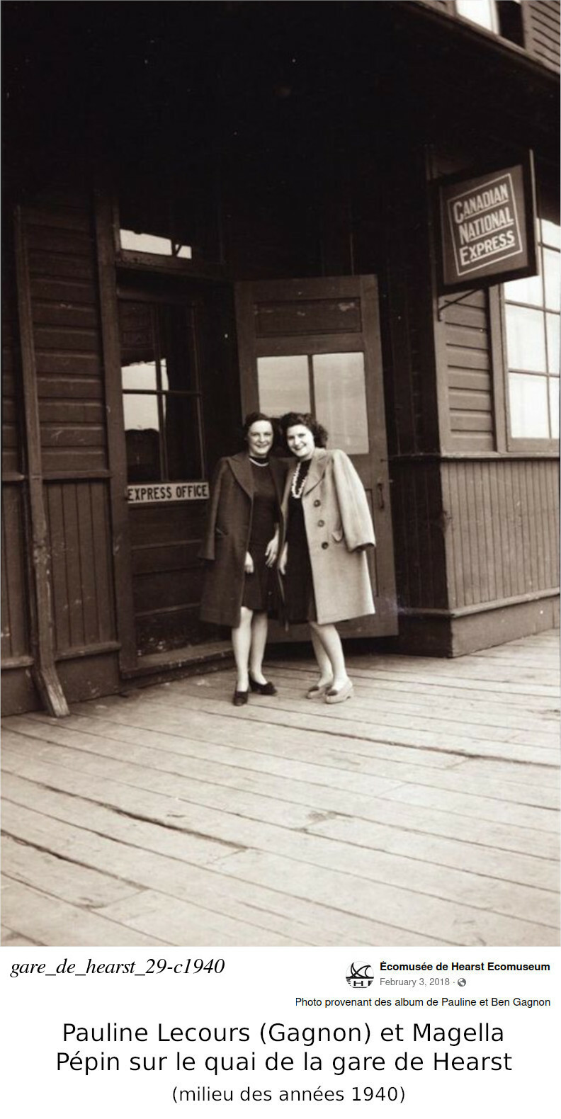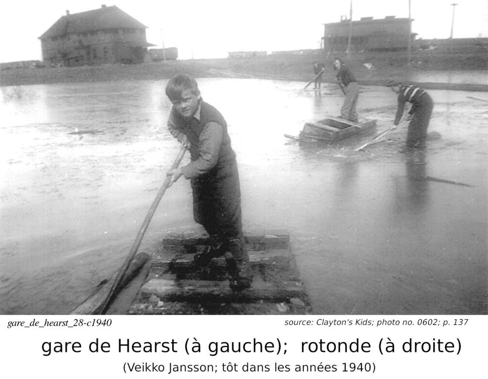 Pour cette prochaine photo, je n'était pas certain si je devais la mettre avec la série de la gare, ou avec la série de la rotonde. Les deux sont dans l'arrière plan... Nous y voyons un jeune Veikko Jansson (né en 1931), s'amusant avec des amis dans la mare d'eau qui se formait près de la gare et de la rotonde. Sa famille est arrivé à Hearst en 1926, de Finlande. Ils étaient une des familles Finlandaise, non loin de mes grand-parents, au Lac Ste-Thérèse. L'histoire de Jansson, dans le livre Clayton's Kids, est aux pages 136 à 140. L'autre photo, avec Pauline Lecours (Gagnon) et Magella Pépin, nous donne un aperçu du quai d'embarquement, et de l'entrée de la gare.