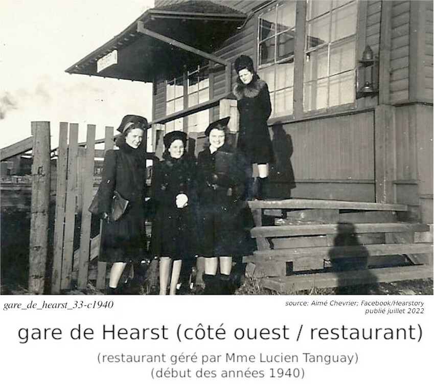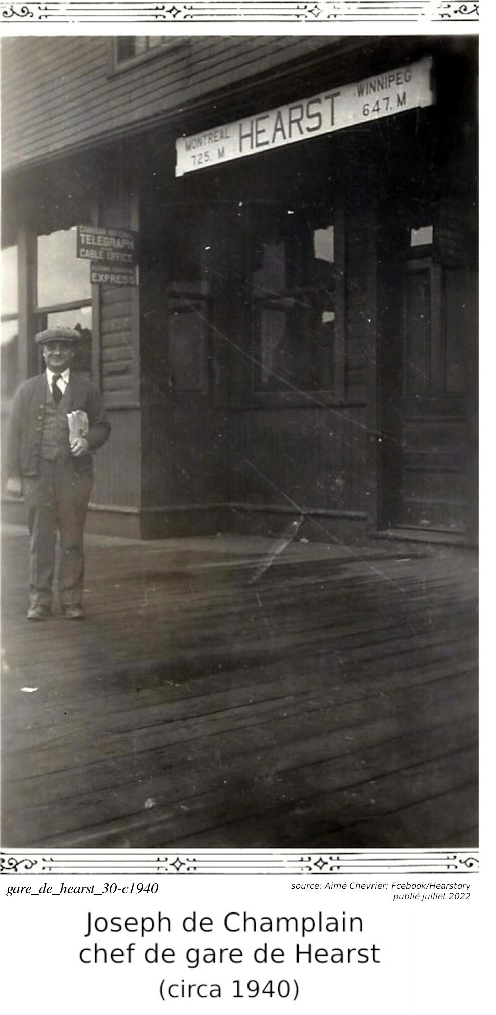 Sur Facebook/Hearstory (groupe privé), Aimé Chevrier a partagé l'histoire de sa famille. Il nous a parlé de son grand-père paternel qui arriva à Hearst, circa 1920-21, et de son grand-père maternel, qui arriva à Hearst dans les années 1920. J'ai recréé ses deux article ici, mais sans les photos qu'il avait inclu dans Facebook/Hearstory. Celui qui nous intéresses le plus est l'histoire de son grand-père maternel, Joseph de Champlain. Joseph de Champlain était Chef de gare à Hearst, du milieu des années 1920, jusqu'au début des années 1940; il était aussi télégraphiste. Il demeurait avec sa famille au deuxième étage de la gare. Aimé nous dit qu'il n'avait que quatres ans lorsque son père a quitter son emploie à Hearst, pour un semblable, à La Malbaie. Malgré son jeune âge, il se souvient bien de son grand-père qui lui faisait visiter la gare. Il se souvient aussi que Mme Berthe Tanguay tenait le restaurant à l'époque.