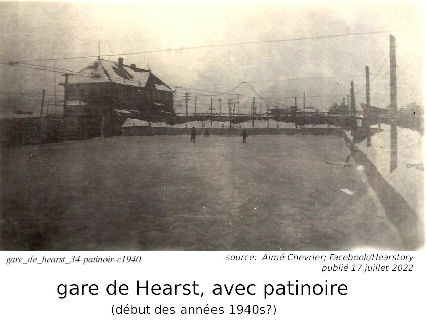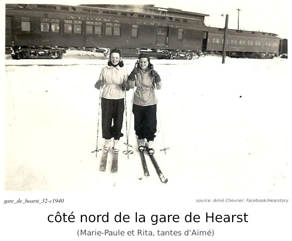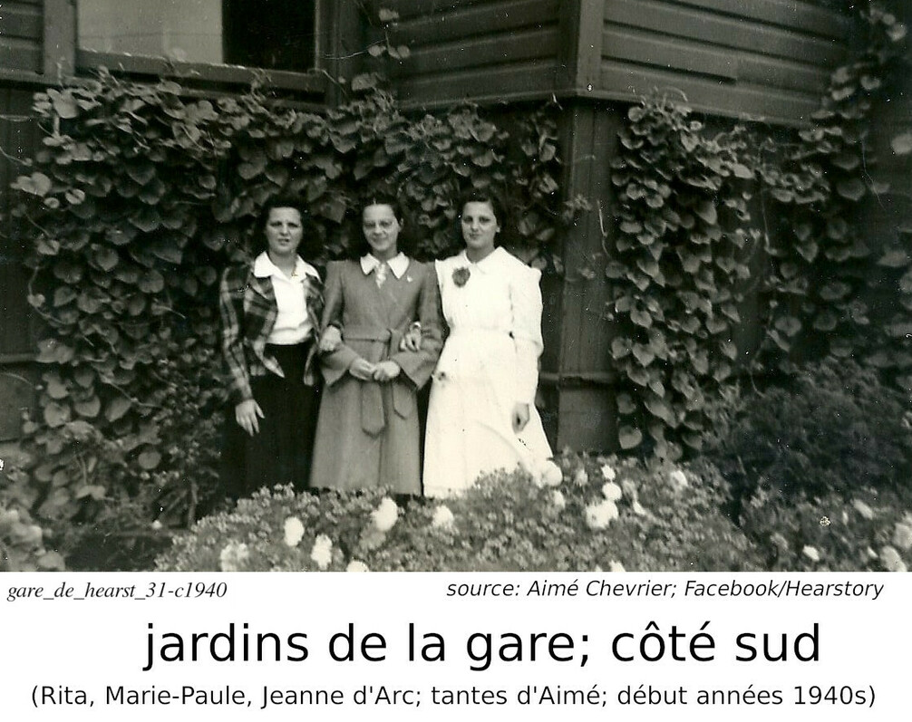 Grand-père nous faisait visiter la gare, le bureau de télégraphe, nous a montré à mettre monnaie sur les rails. Il fumait la pipe, possédait une collection de pipes, mais souvent utilisait une pipe en plâtre; souffrant de diabète, il nous laissait goûter ses petites saccarines. Les de Champlain et leurs enfants avaient des passes pour voyager train, donc les tantes qui s'occupaient beaucoup de nous, nous ont permis voyager, sans frais, pour aller visiter notre tante Carmen à Moobeam, visiter Kapuskasing, grande ville pour nous à l'époque. Même après leur départ de Hearst, notre famille a pu les visiter en train, durant l'été de 1945. La présence des de Champlain est omniprésente pendant notre enfance, et notre relation avec les grands-parents, les oncles et tantes ne laisse que d'heureux souvenirs d'enfance. Ce sont des photos de familles de Joseph de Champlain; donc du grand-père d'Aimé, de ses tantes. La dernière photos est celle de la patinoire près de la gare. Elle rejoint celle du terrain de tennis, démontrant que la gare était aussi un "centre communautaire" les premières années de la ville de Hearst.
