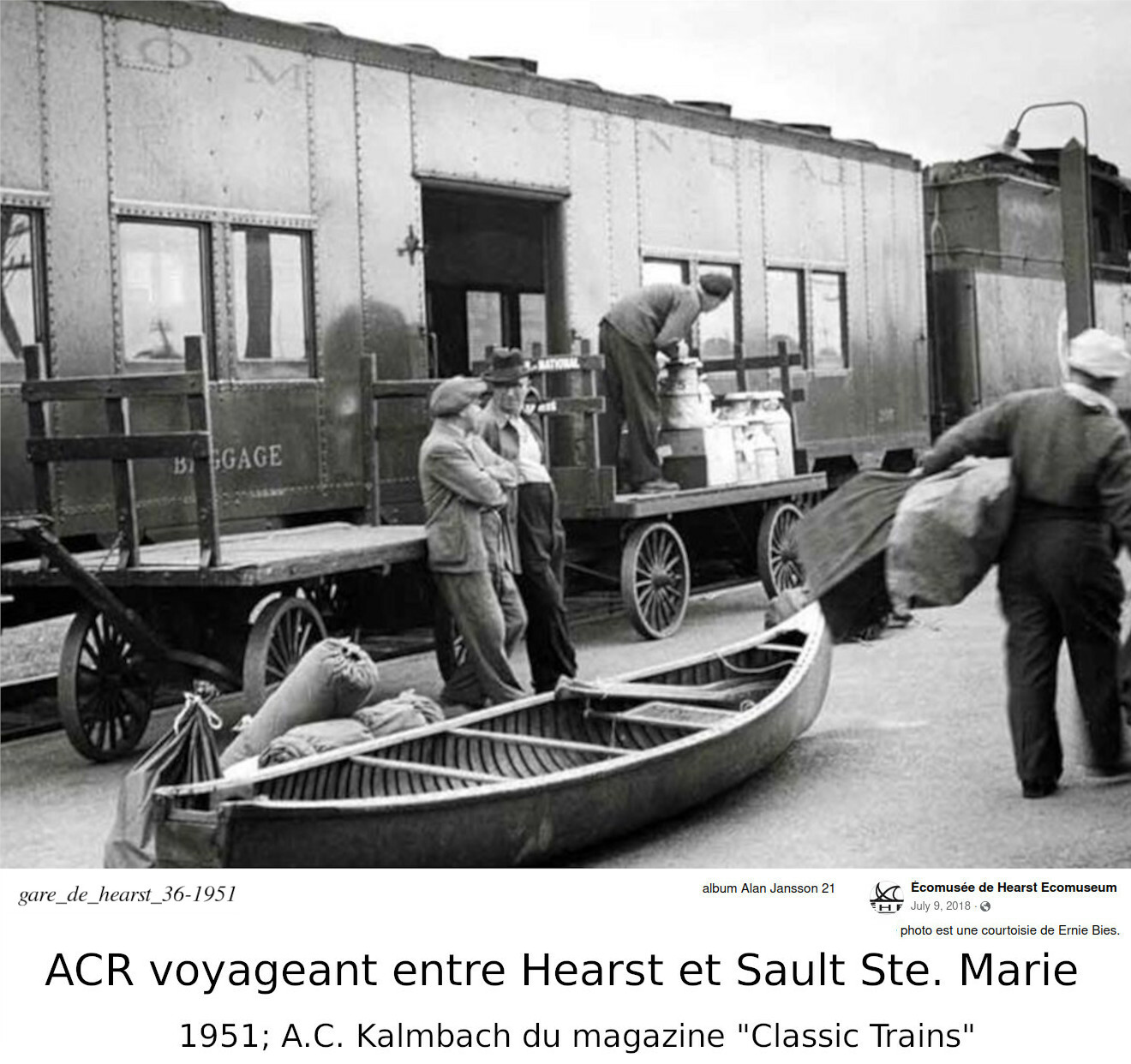 Jusqu'à présent, nous avons vu des photos de la gare pour chaque décénies de son histoire. En voici deux du début des années 1950 (malgré qu'il est possible que la première soit plus vieille...). La vieille gare de Hearst desservait le CNR (Canadien National) et l'ACR (Algoma Central). A l'occasion, l'ACR transportait parfois des marchandises "hors de l'ordinaire", comparé à ce que le CNR transportait. Par exemple ce canoë, de l'équipement de camping. Plus récemment, pendant la saison hivernale, ce sont des motoneiges qu'il transporte... les motoneigistes conduisent alors leurs motoneiges dans les sentier pour le retour (ou vice-versa). Comparé au CNR, l'Algoma Central a desservi un plus grand nombre de petites localités, avec ou sans chemin pour s'y rendre. Par exemple, je me souviens allé à Dubreuilville, chez mon oncle, pour lui aider à refaire la toiture sur son garage. Nous avions utilisés l'ACR pour s'y rendre.