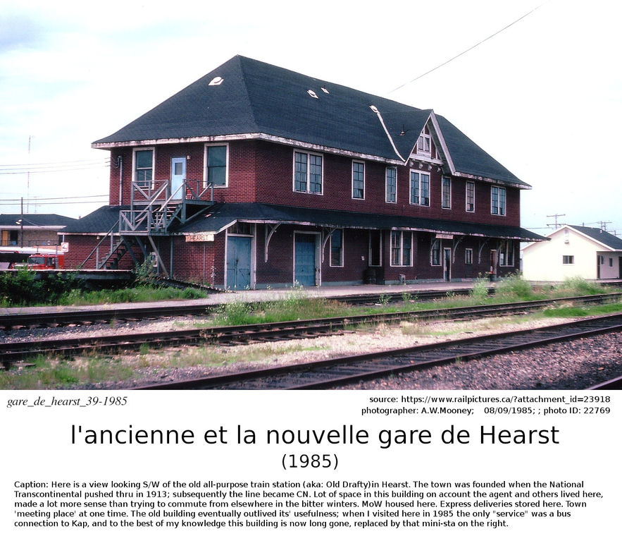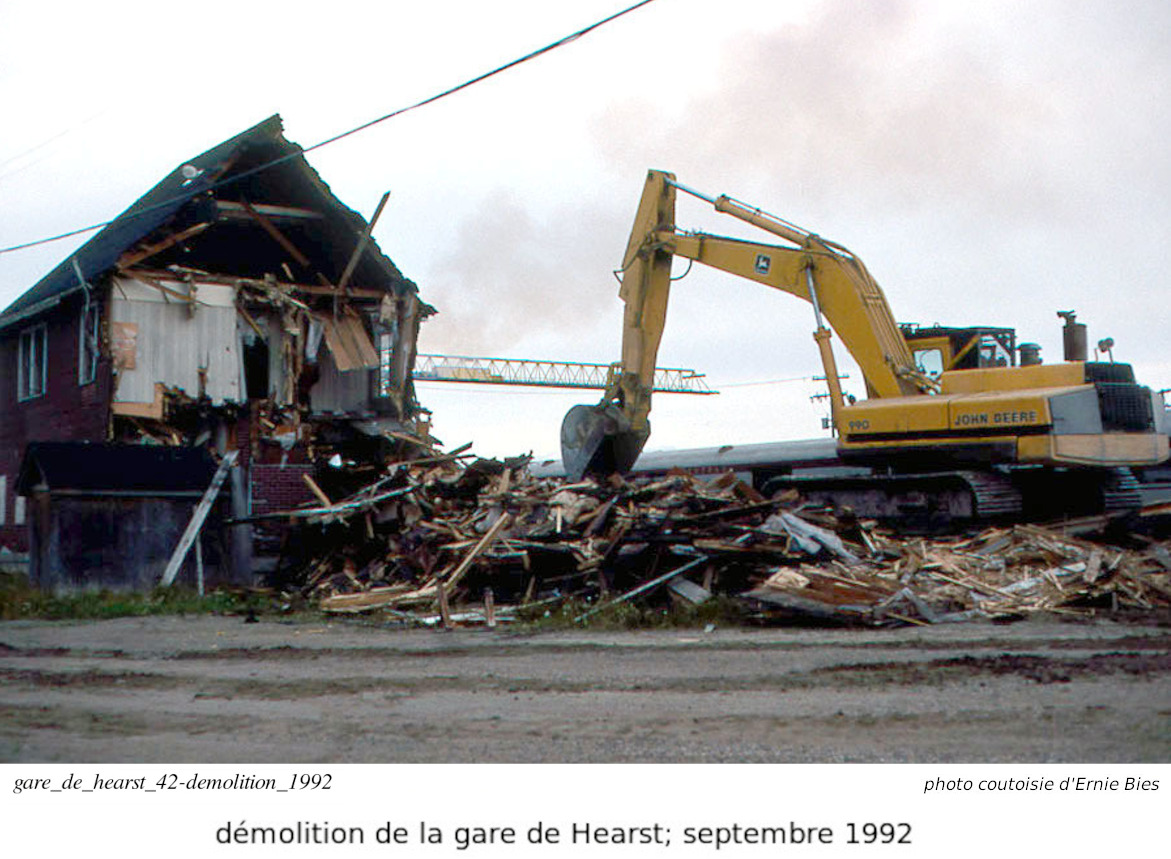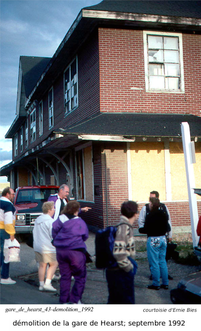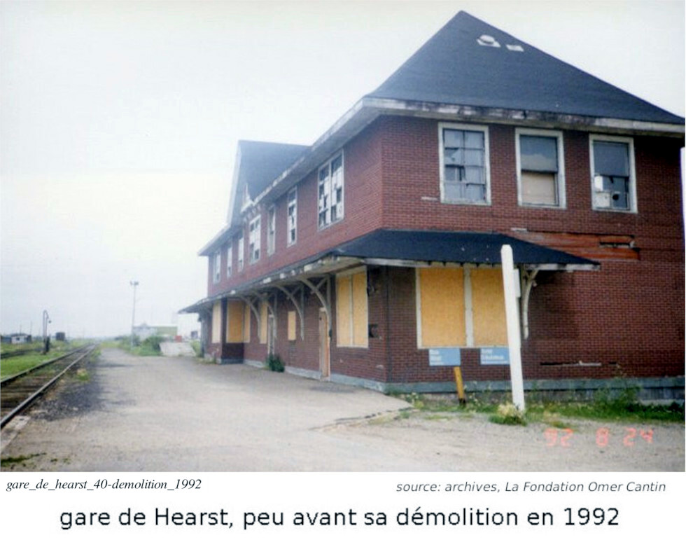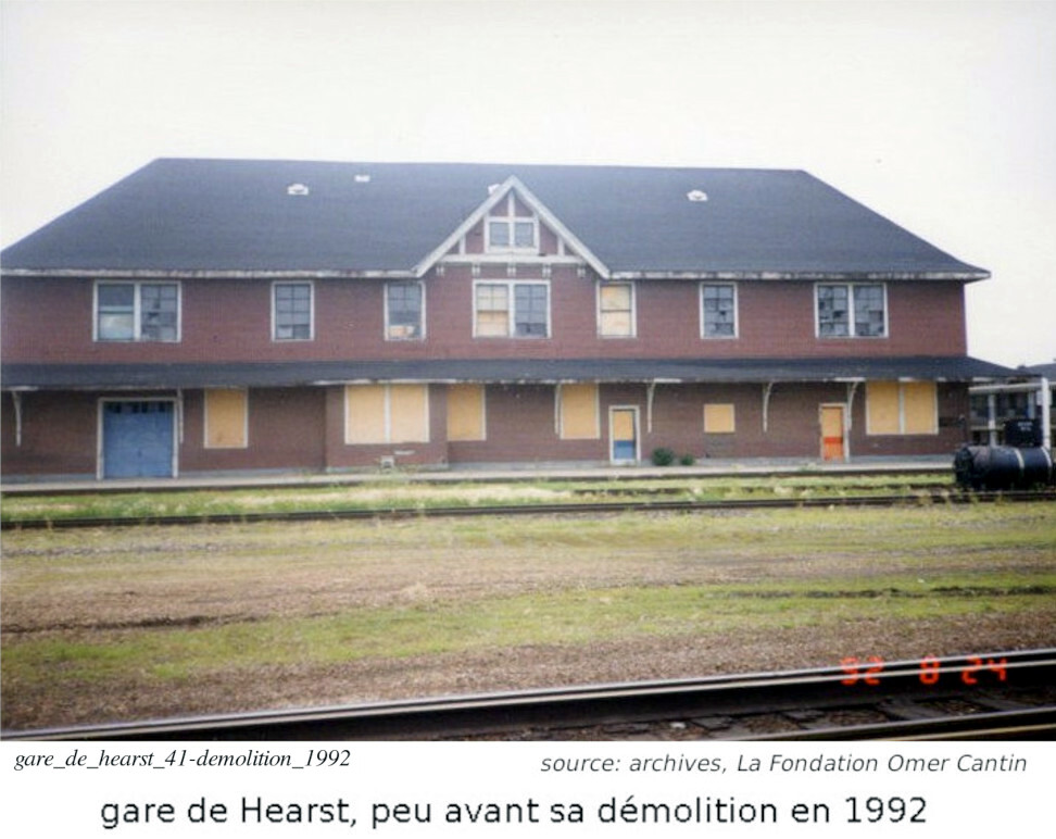J'ai prit le train dans les années 1970 pour me rendre à Québec (Lévis); l'ACR pour me rendre à Dubreuilville. Je l'ai aussi prit en 1981, pour me rendre à Toronto. Déjà, en 1982, le train ne venait plus à Hearst; il s'arrêtait à Kap, mais un autobus y faisait la navelle. L'année suivant, le trains s'arrêtait à Cochrane; l'autobus du Ontario Northland faisait la navette, de Hearst jusqu'à Cochrane. Je parlerai brièvement du service passagers du train, dans quelques lignes. Pour l'instant, c'est le temps de mentionner la démolition de la vieille gare...