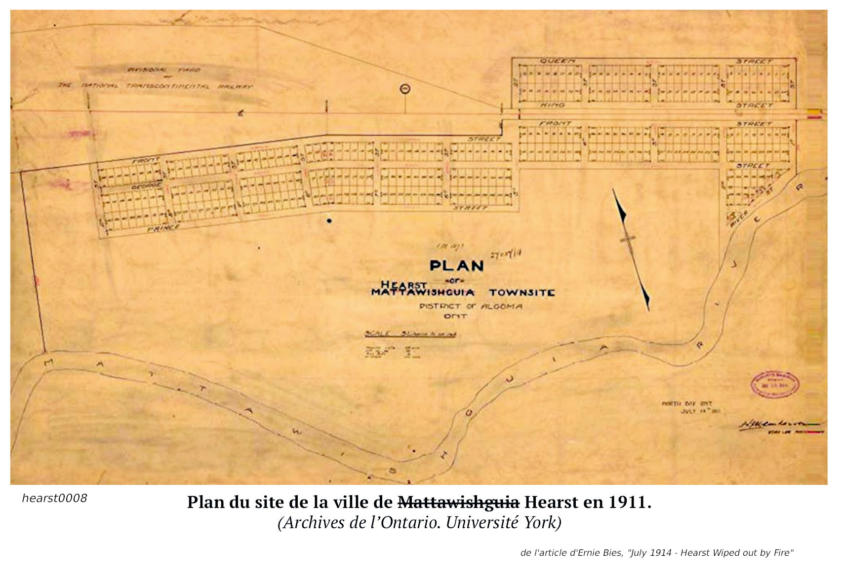 Commençons par le début: l'emplacement de la gare de triage, qui comprend bien sur, la gare. C'est une photo que nous avons déjà vu, sur la page Hearst... avant que Hearst n'existe. Ernie Bies nous a présenté cette carte sur Facebook/Hearstory. Elle nous vient aussi de son article, July 1914 - Hearst Wiped out by Fire. Cette photo nous démontre le plan de la future ville de Hearst. Nous voyons clairement, au haut à gauche, le site de la National Transcontinental Railway, site où est la gare. Notez que le nom donné à cet emplacement, lors du dévelopement initial du croquis, était "Mattawishguia", nom de la rivière traversant l'endroit (peut-être suivant l'exemple de Kapuskasing, nom de la ville, et de la rivière de cet endroit?).