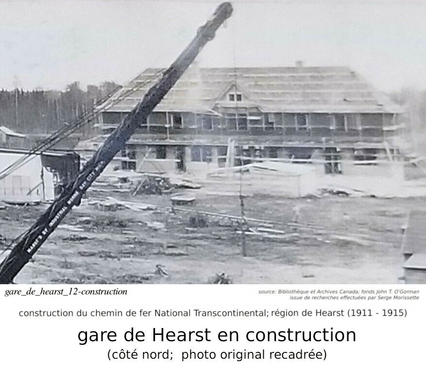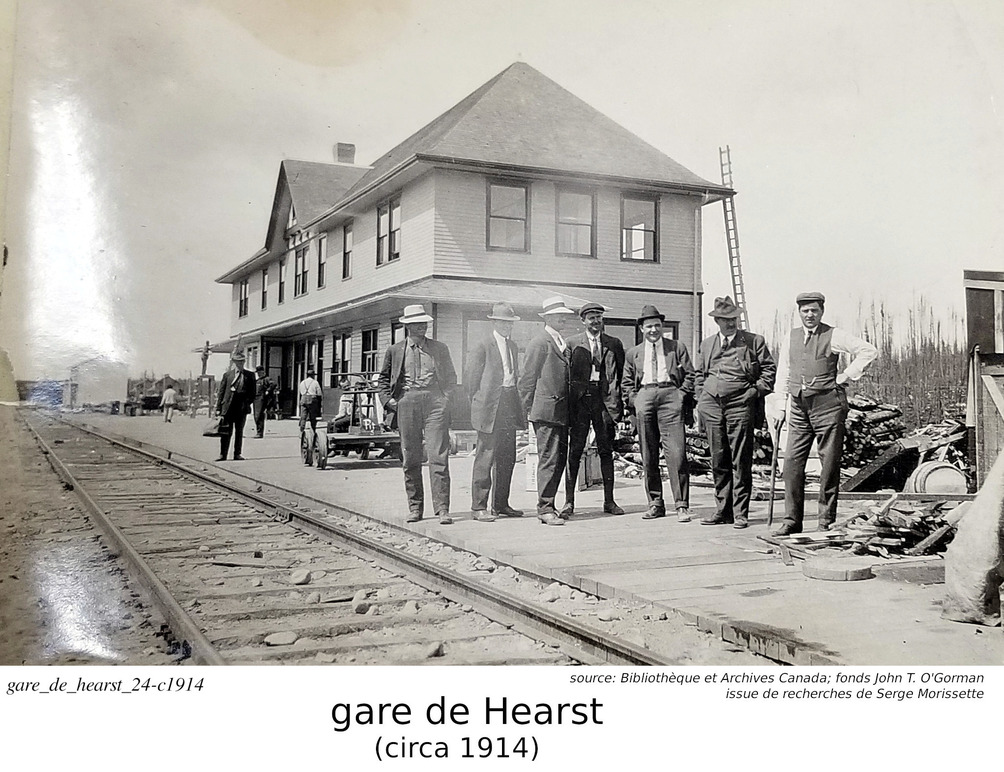 Cette photo de la gare de Hearst (circa 1914) nous vient d'une recherche que Serge Morissette a effectuée, concernant la contruction du chemin de fer National Transcontinental (nous avons discutés de sa recherche un peu plus haut), plus précisément sur le tronçon passant par Hearst. La photo ne dit pas que c'est la gare de Hearst, mais Serge l'a trouvée dans la collection John T. O'Gorman de Bibliothèque et Archives Canada, sous la section de contruction du tronçon de la National Transcontinental passant à travers Hearst. Comme Hearst est un Point Divisionaire, et que cette gare ressemble à deux goûtes d'eau à la gare de Hearst... nous en concluons que c'est en effet, la gare de Hearst. Les personages sur la photo semblent être des dignitaires... peut-être venu à Hearst pour inspecter les travaux terminés...? Est-ce les mêmes personages que l'on a vu sur la photo, plus haut, dans la section de construction du NTR, composée d'un wagon passager avec plusieurs personages bien vêtu, certain sur un "speedster"? Ca ne me surprendrais pas!