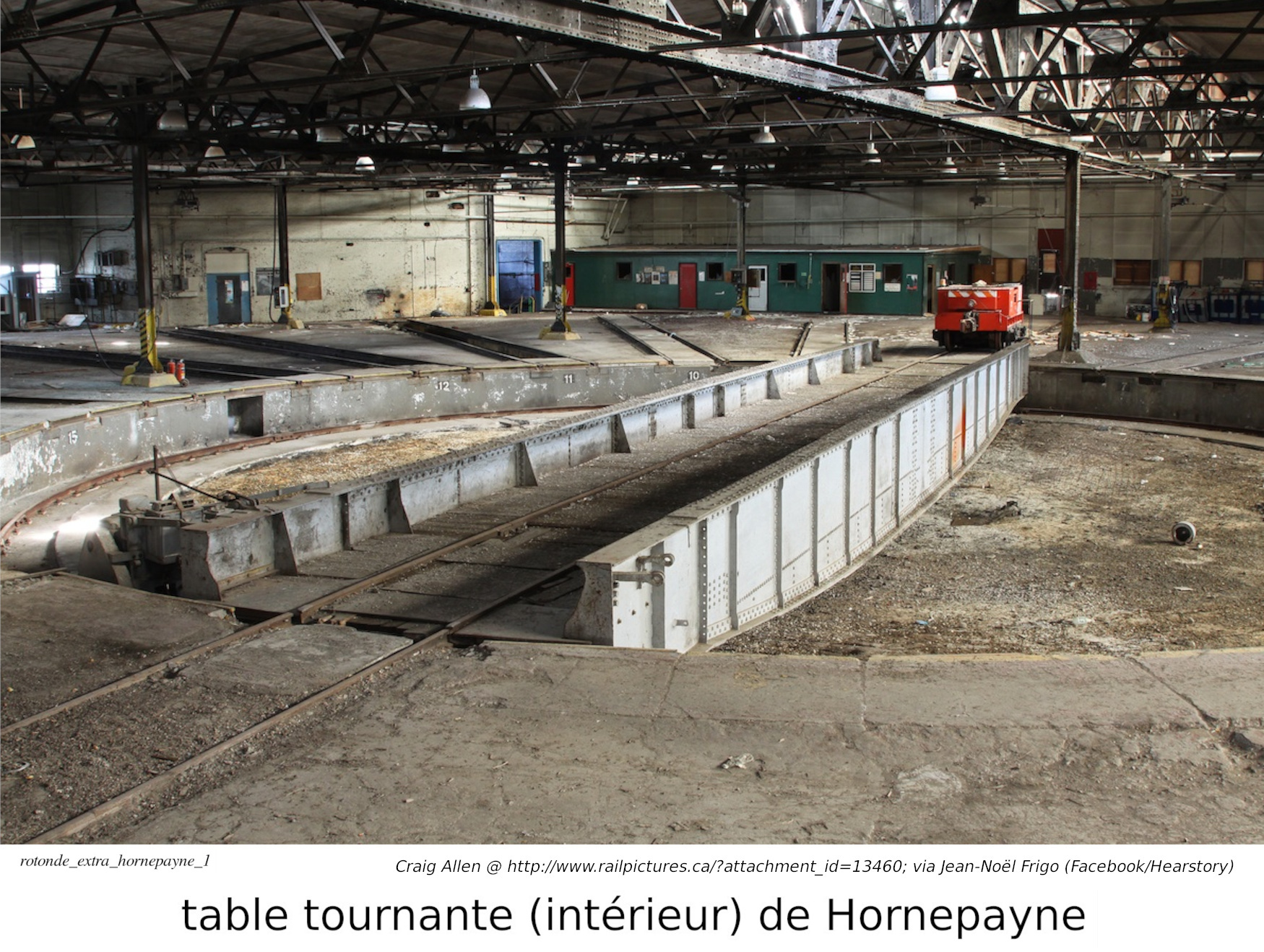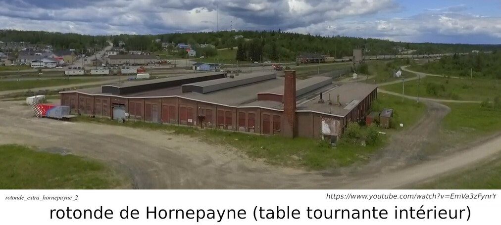 Jusqu'au milieu des années 1990, Hornepayne utilisait une table tournante, à l'intérieur de sa rotonde. Jean-Noël Frigo nous l'a apprit dans un commentaire sur la publication de Serge. Il a produit un lien vers un vidéo Youtube de la rotonde d'Hornepayne (la photo est un "screenshot" que j'ai pris de la vidéo). Selon https://www.canada-rail.com/ontario/RY/hornepayne.html, la gare originale de Hornepayne fut construite en 1912, et démolie en 2020 (une nouvelle gare fut construite; le Canadien, train de Toronto à Vancouver, y fait un arrêt régulier). Jean-Noël Frigo m'a confirmé que, à l'été 2022, la rotonde d'Hornepayne est encore debout.