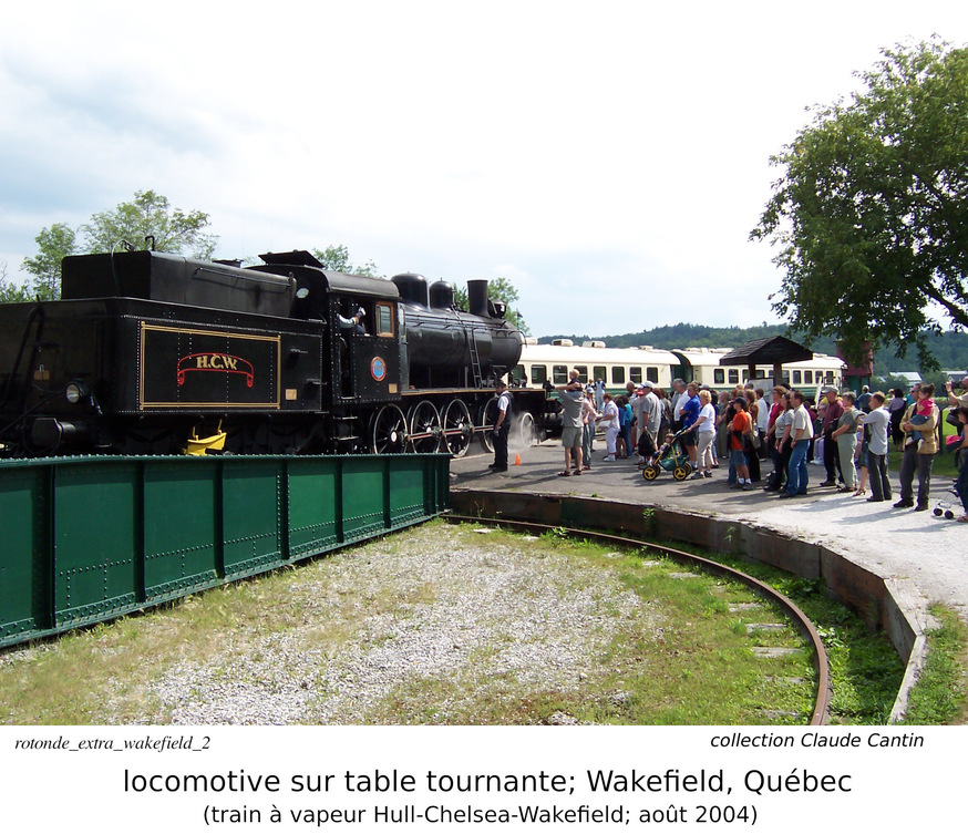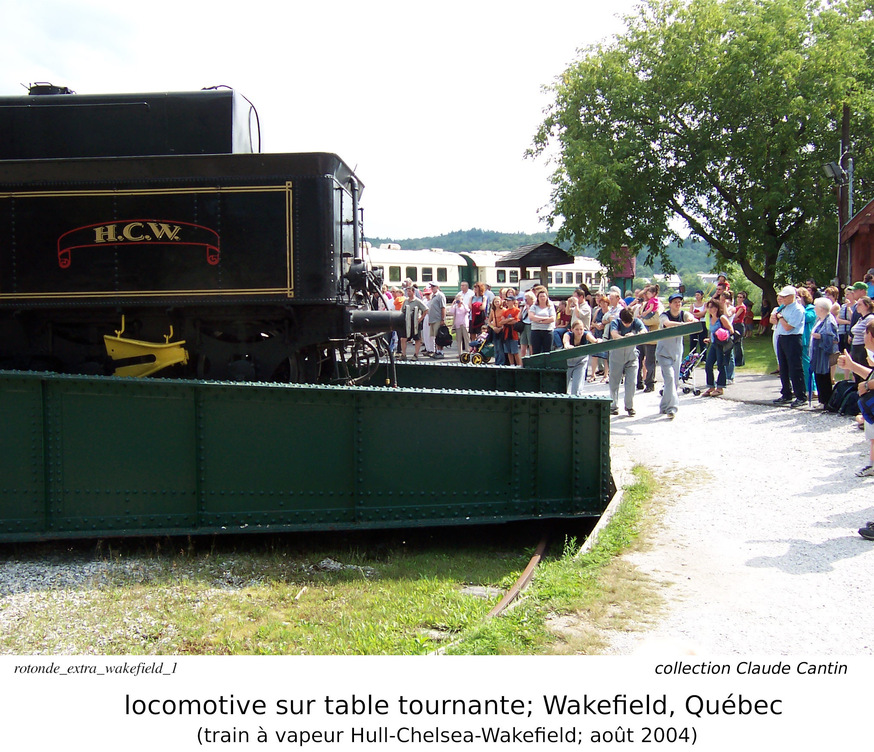 De 1992 jusqu'en 2011, le train à vapeur touristique "Hull-Chelsea-Wakefield", dans la région de la capitale Nationale, nous a donné l'occasion de voyager sur un trains arborant des wagon suédois des années 1940 tiré par une locomotive elle aussi suédoise, entrée en service en 1907 (informations sur cet article et sur wikipedia. A Wakefield, un pont tournant est utilisé pour tourner la locomotive. Celui-ci, avec la locomotive sur le pont, est activé manuellement, par une équipe de trois personnes. J'ai eu la chance de le voir en personne à quelques occasions, dont une en août 2004.