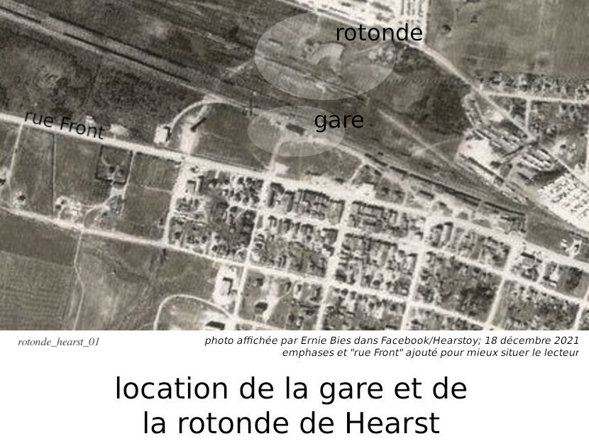 A Hearst, la rotonde ferrovière se trouvait au nord du chemin de fer, là ou on a plus tard construit le moulin à scie Fontaine Lumber (aujourd'hui Tembec) . J'inclus six photos qui démontrent bien le début et la disparition de ces rotondes ferrovières. Cette photo de localisation avait été publié par Ernie Bies, dans Facebook/Hearstory. Je l'ai modifié légèrement pour y mettre l'emphase sur les deux endroits, et pour y mettre le nom de la rue Front, question d'orienté les lecteurs. Dans sa publication, Serge avait inclu six photos. J'en ai rajouté quelques unes, ajoutant de l'information au sujet.