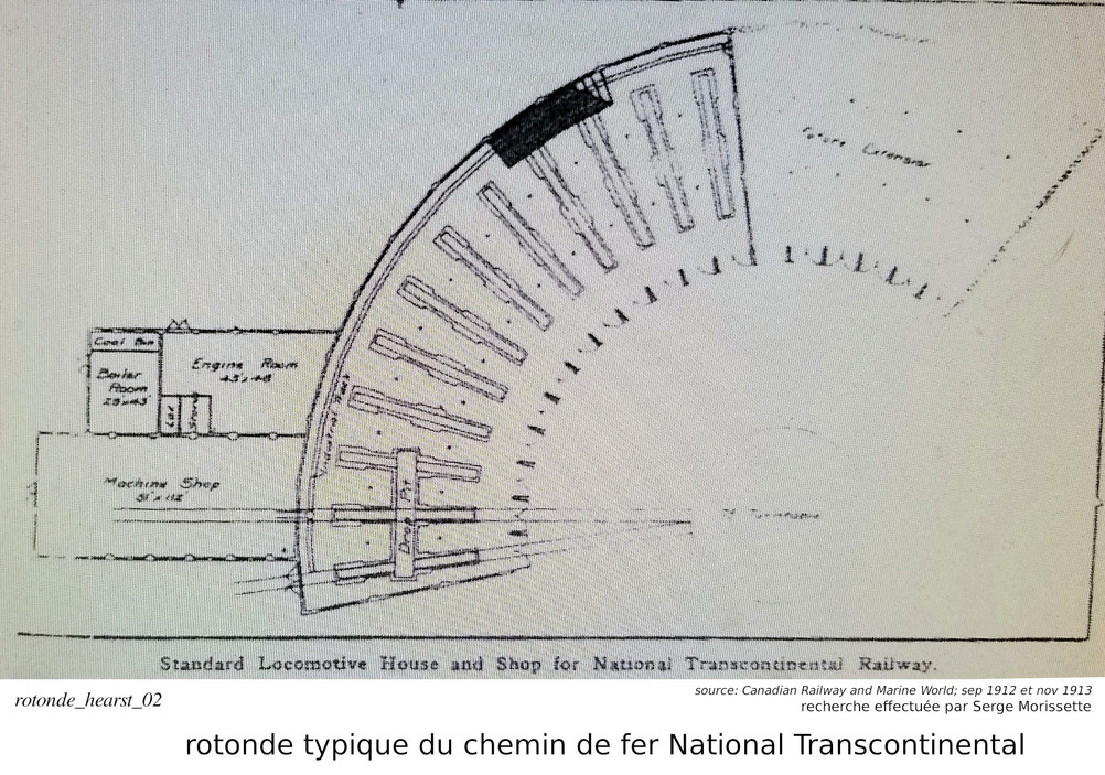 La première photo provient de la revue Canadian Railway and Marine World pour septembre, 1912 et plus tard avec certaines améliorations en novembre, 1913. Elle démontre le modèle des rotondes ferrovières qui seront érigées dans les centres divisionnaires. Le modèle inclut des rails qui proviennent de la voie ferrée principale. Les rails déposent l'engin sur un pont au dessus d'une table tournante. S'il s'agit d' de maintient ou de réparation, la table tournante tourne son pont vers une de douze travées d'ateliers placées en forme semi-circulaire autour de la table tournante. Tout près, on y retrouve la salle des moteurs, la chaufferie et l'atelier d'usinage. S'il s'agit seulement de retourner l'engin dans le sens inverse, on tourne la table tournante 180 degrés et on retourne l'engin sur les rails.
