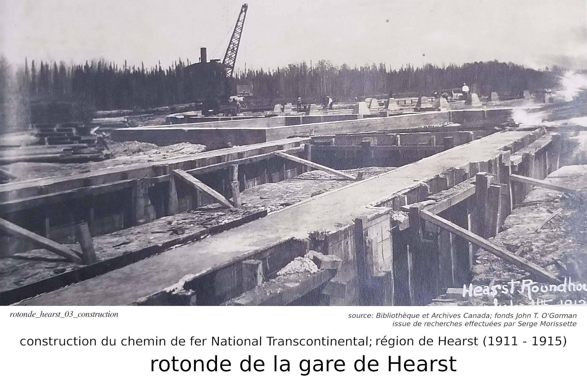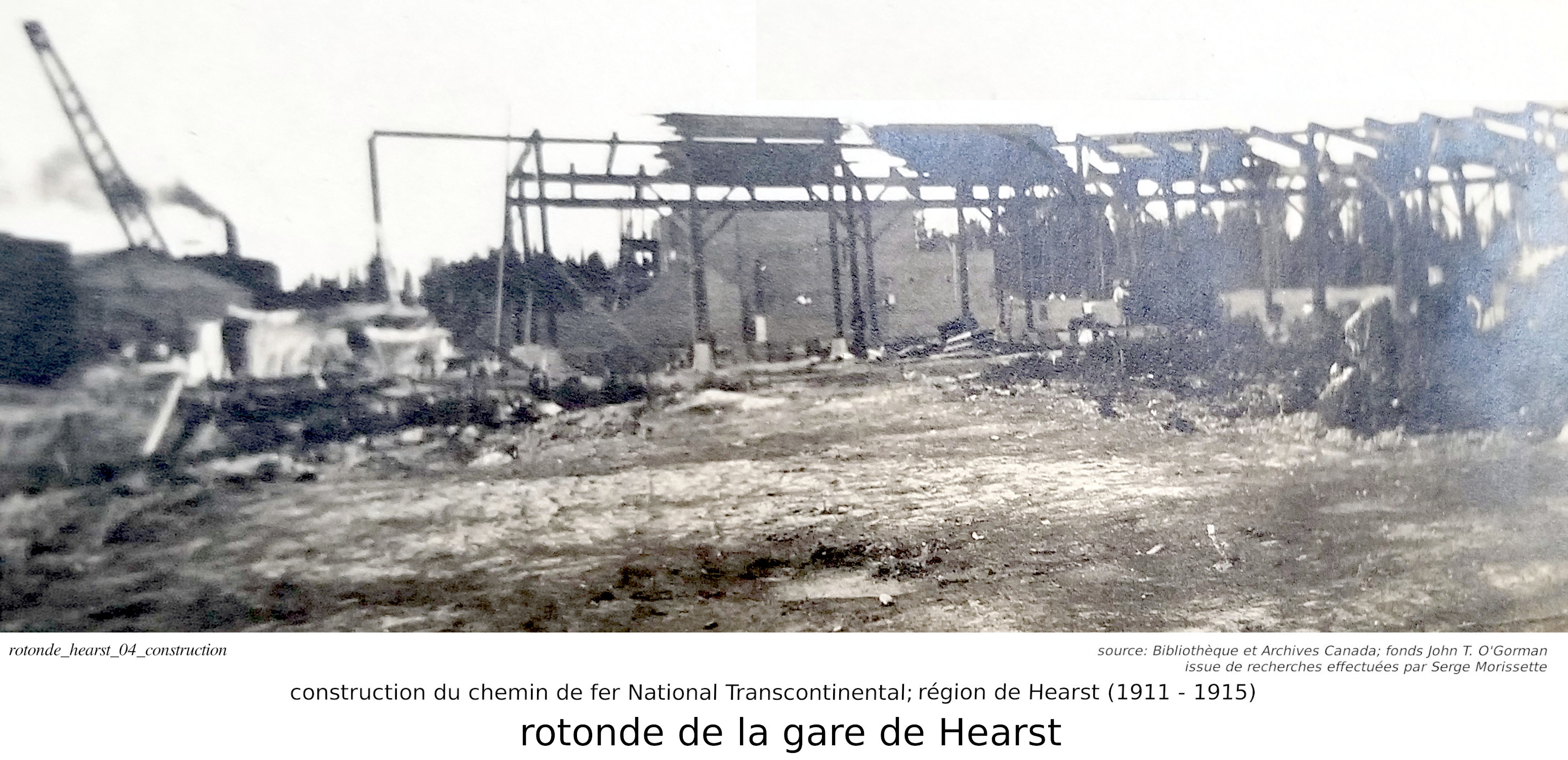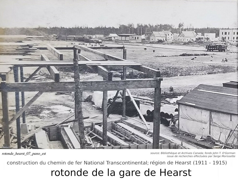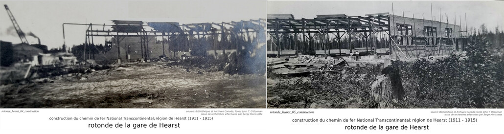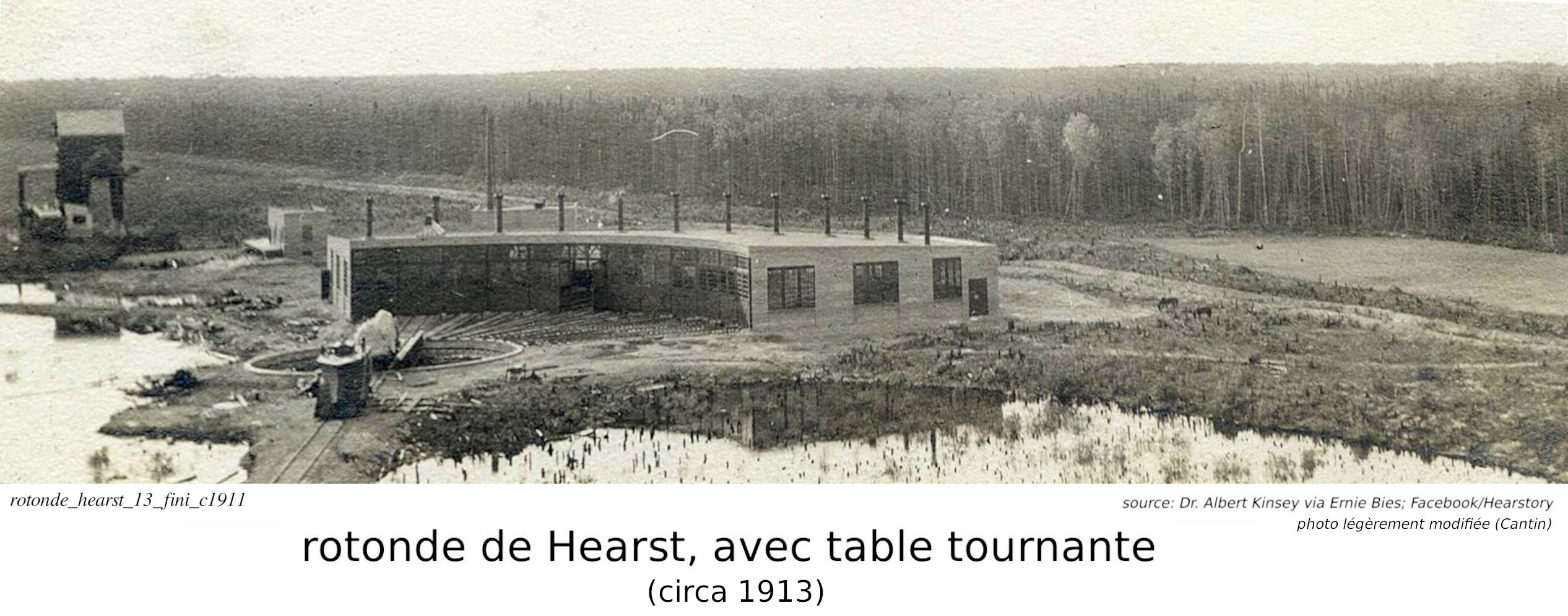 Nous en avons maintenant fini avec les photos panorama et combinaison/superposées. La rotonde est maintenant terminée. C'est la photo 4 de la publication de Serge: La quatrième photo est la rotonde ferrovière de Hearst complétée vers 1913. Cette photo provient du docteur Albert Kinsey et a été affichée par Ernie Bies sur Hearstory. On y distingue clairement les douze travées d'ateliers, le pont et la table tournante.