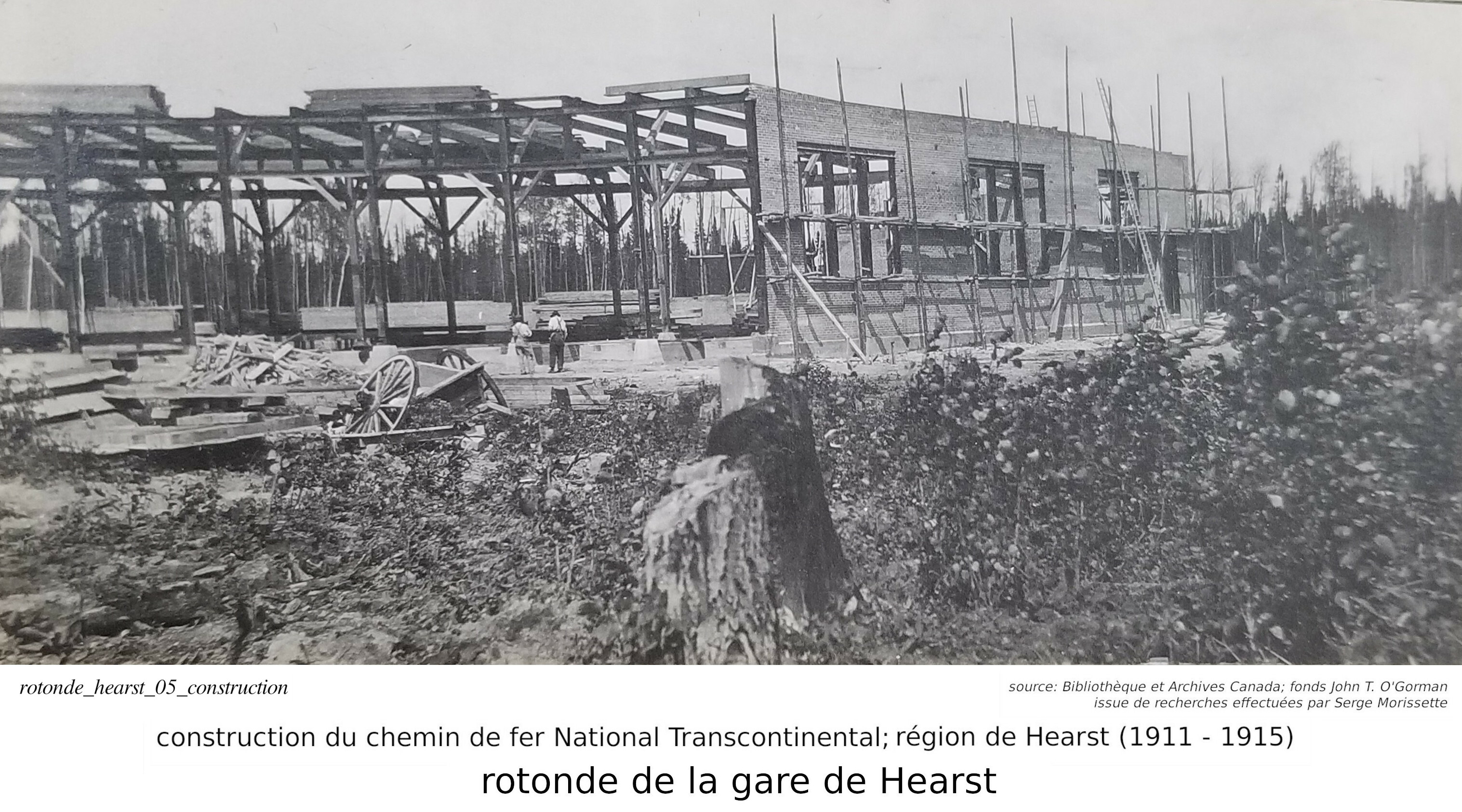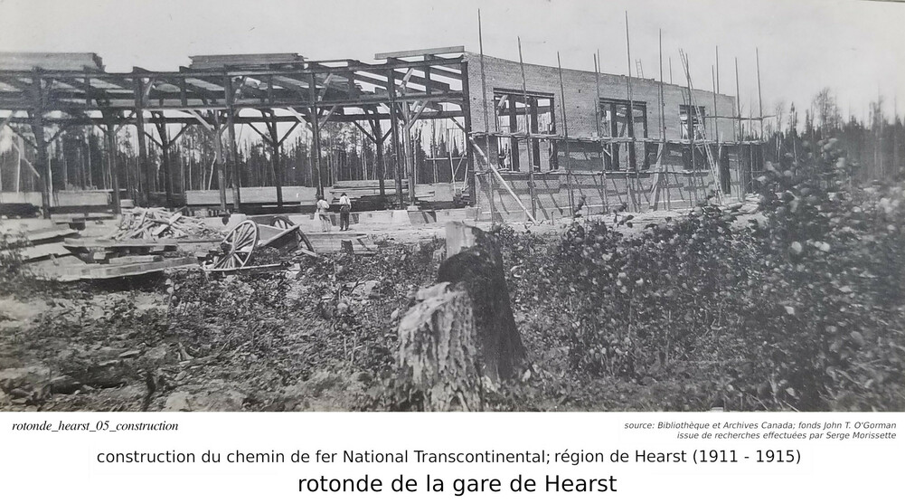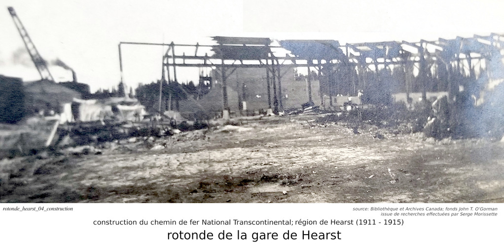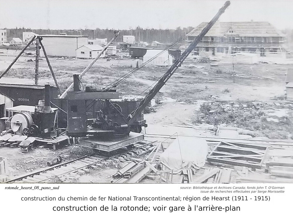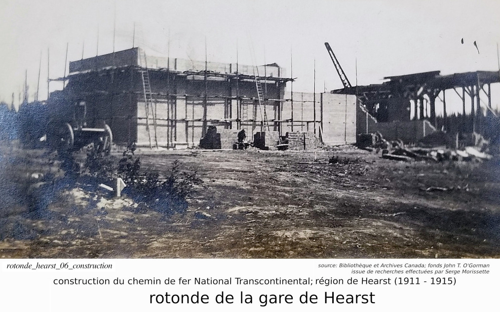 Avant de passer au prochain "panorama", nous avons une autre photo qui nous vient des recherches de Serge, lorsqu'il a publié ses articles sur la construction du chemin de fer National Transcontinental. Elle semble est prise d'un différent angle, de l'arrière-gauche de la rotonde, pour les salles où serait les services de maintenances ou un atelier spécialisé. Cette structure est probablement celle que l'on voit (seulement un mur) à l'arrière, sur la photo 04 (la photo de gauche du panorama ci-haut); on y voit le demi-mur, qui ensuite monte jusqu'au toir de la rotonde, donc probablement prise la même journée. |