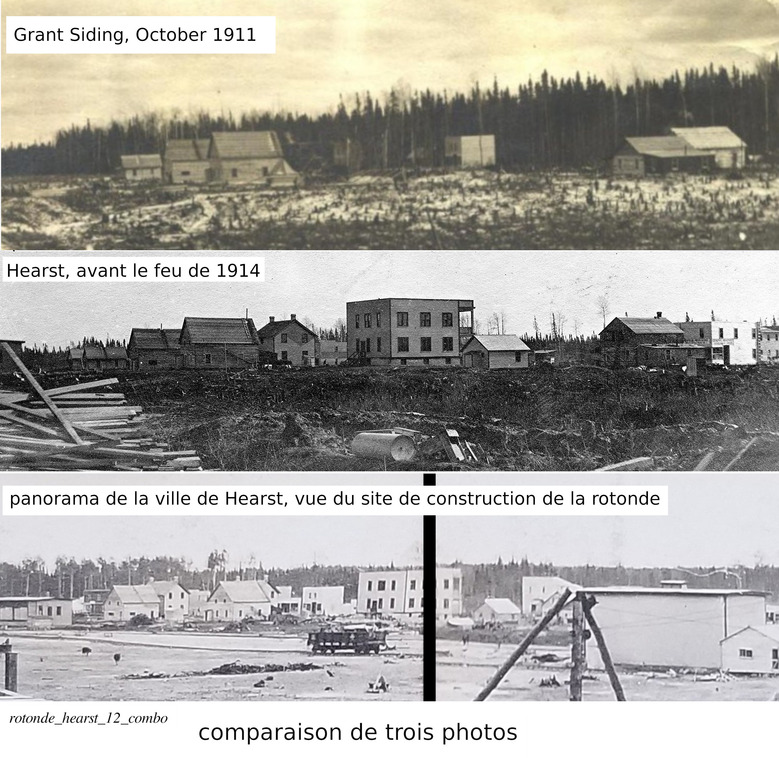 Cette prochaine et dernière combinaison était un peu plus truquée à construire. Elle nous montre à peu près la même endroit, environ un an entre chaque photo. La première photo nous vient d'Ernie Bies Sur la page Hearst... avant que Hearst n'existe, nous avons parlé du feu de juillet 1914 qui a détruit la ville de Hearst. Ce feu, Ernie Bies nous en donne une bonne description dans son article, July 1914 - Hearst Wiped out by Fire. Cette photo nous vient de cet article; j'en ai prit la partie en haut à droite pour la photo de combination. La deuxième photo nous vient aussi d'Ernie Bies (originalement de Dr. Albert Kinsey); il l'a partagé avec les membre de Facebook/Hearstory, et décrit les bâtisses comme maisons appartenant à la NTR. Finalement, la troisième photo est une partie de panorama que j'ai fait avec les photos trouvées par Serge Morissette. Supperposées l'une au-dessus l'autre, et en utilisant seulement les parties des photos qui nous intéressent, nous pouvons y voir une évolution de cette partie de Hearst, entre circa 1911 et 1913.