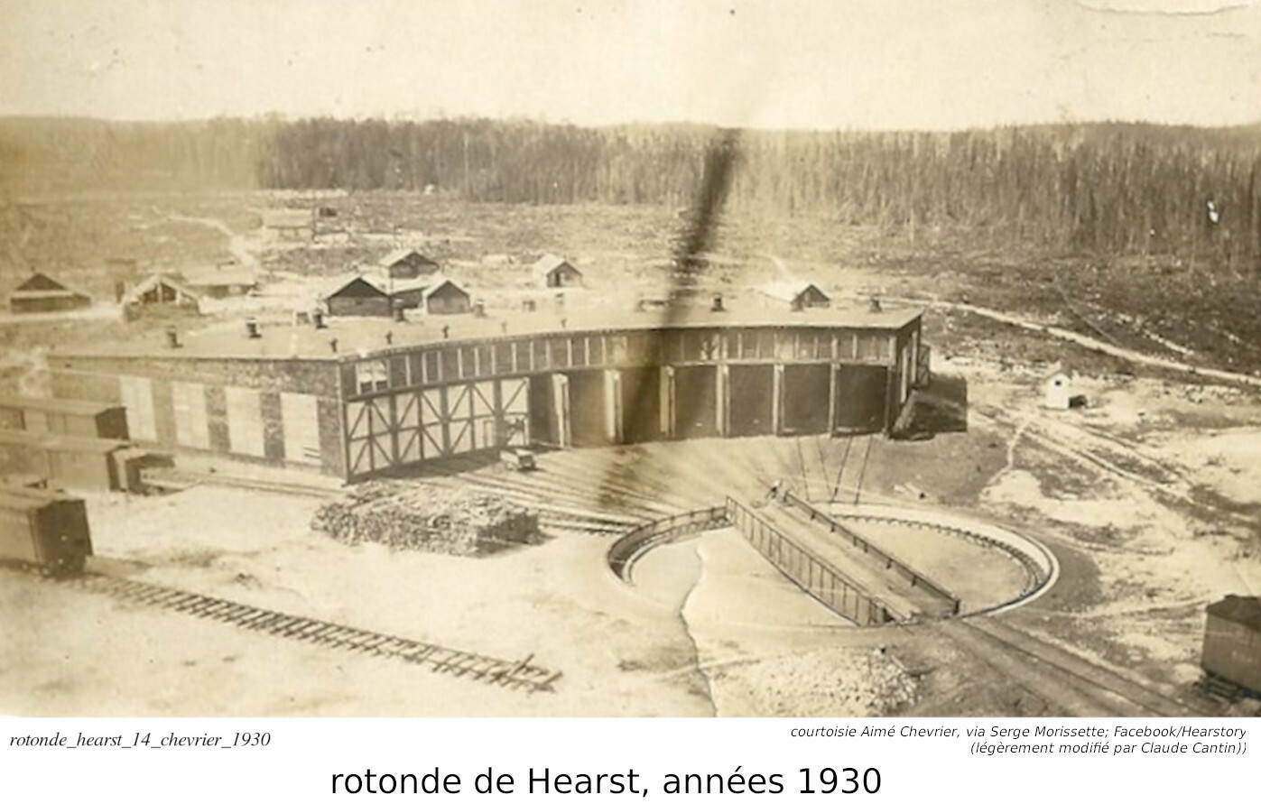 Aimé Chevrier, via Serge Morissette, nous as fourni une photo de la rotonde des années 1930. C'est la photo no. 5 de la publication de la rotonde de Serge dans Facebook/Hearstory. Texte de Serge: La cinquième photo est la rotonde ferrovière de Hearst des années 1930s. Cette photo provient de Aimé Chevrier. Son grand père, Joseph De Champlain était gérant de la gare durant les années 30s jusqu'à son départ en 1943. La photo a été affichée sur Hearstory. La photo est très claire et on peut facilement distinguer les douzes travées d'atelier, le pont et la table tournante. Regardez attentivement la photo: j'ai l'impression qu'une personne tourne le pont de la table tournante... (voir photos du train à vapeur de Wakefield dans quelques photos).