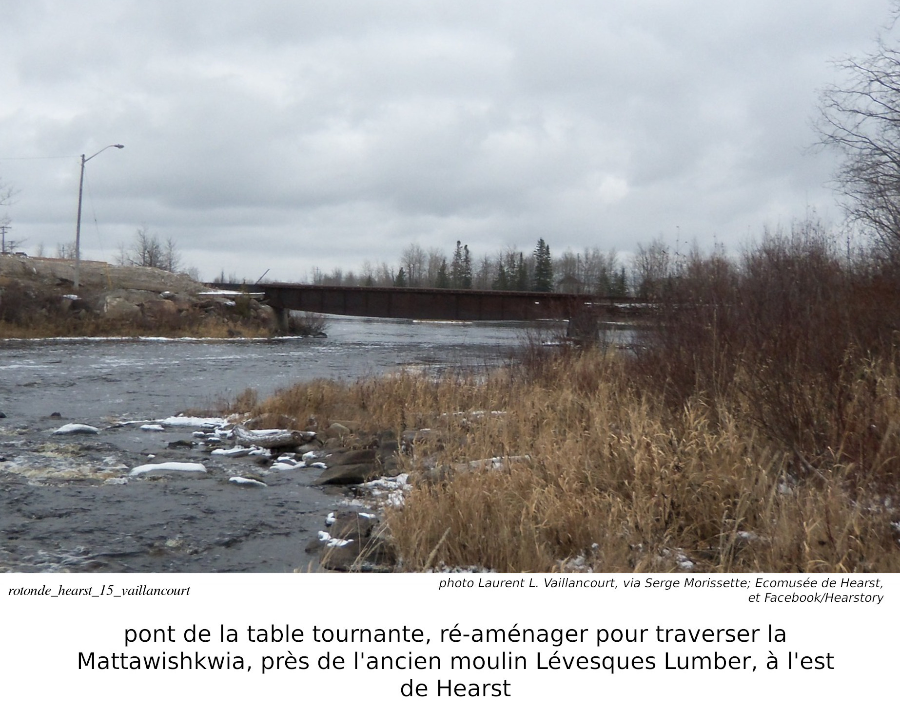 Cette dernière photo de la publication de Serge (photo 6) nous montre un vestige existant du pont de la table tournante. Serge nous dit que: La rotonde ferrovière de Hearst est démolie au milieu des années 50s, mais on peut encore la retrouver en partie. Si j'ai bien compris l'affiche de Steve Lachance, le garage du moulin à scie Fontaine Lumber près de la gare (aujourd'hui Tembec) serait ce qui reste des ateliers et travées de la rotonde ferrovière. Laurent Vaillancourt nous apprend, appuyé de la sixième photo, que le pont de la table tournante a servi de pont traversant la rivière Mattawishquia, là ou était le moulin à scie Levesque Lumber à l'est de Hearst. Un gros merci à Serge Morissette pour nous avoir fait découvrir la rotonde ferroviaire de Hearst (et pour la serie d'une centaines de photos venant des fonds John T. O'Gorman de Bibliothèque et Archives Canada). Je termine la section de la rotonde de Hearst avec six photos, démontrant quelques autres rotondes, l'une d'entre elles à 130km de Hearst, à Hornepayne.