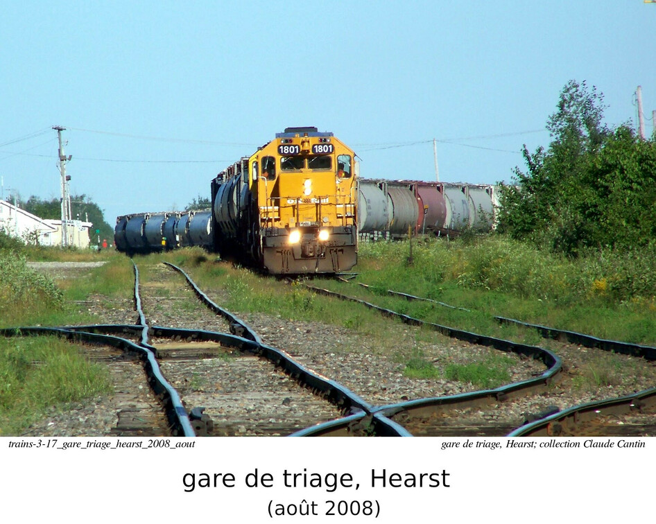 Vous pouvez "zoomer" sur la carte pour y voir plusieurs détails, comme les quelques différents embranchements ferroviaires pour les moulins à scies et entreprises forestière de Hearst. En arrivant à Hearst après avoir traversée la rivière Mattawishkwia, vous arrivez dans le secteur St Pie X, puis vous traversez cette même voie. Vous êtes maintenant dans le coeur de Hearst. Si vous vous stationnez dans l'un des grand terrains de stationnements, pour la plupart en gravier, au nord de la rue Front, nom que porte la route 11 en traversant Hearst, vous remarquerez l'ampleur de la gare de triage. Plusieurs voies ferréez en parallèle, avec des trains contenant soit des wagons de marchandises, ou des wagons avec des produits de la forêt. Souvent, lorsque je viens à Hearst, surtout quand mes deux garçons étaient plus jeune, nous allions faire un tour sur ces voies ferrées, pour y voir les trains. J'en reviendrai dans quelques lignes, avec plusieurs photos à l'apuie. |