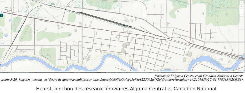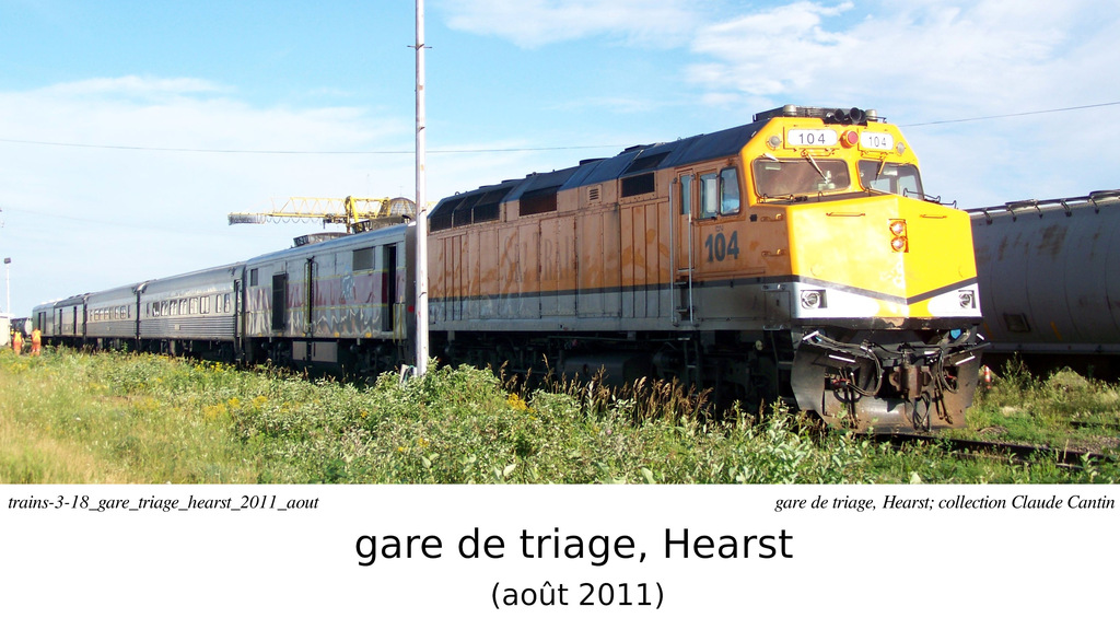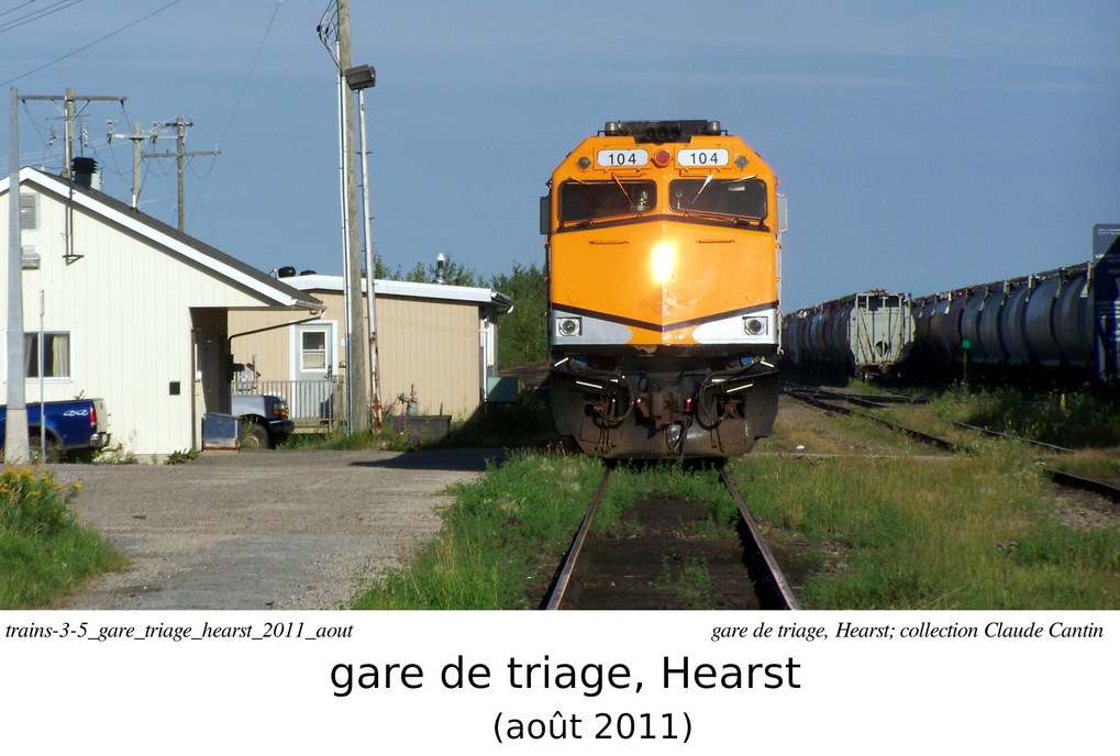Je présume que le carré rouge sur la voie ferrée désigne qu'elle est fermée?... La locomotive 104, photo prise en 2011, semble contenir des wagons passagers, en plus de wagons de marchandise. Probablement un train utilisant la route Hearst - Sault Ste Marie, donc l'Algoma.