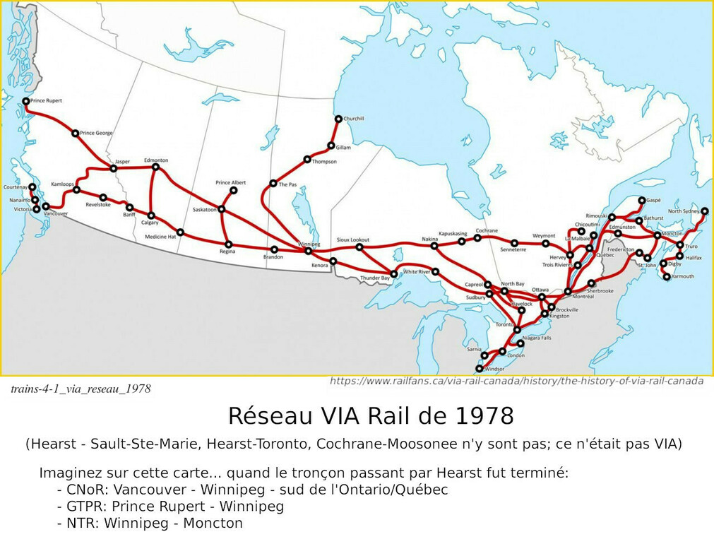 Pour vous donner une idée par où passaient ces chemin de fer, j'ai inclue une carte qui démontre par où les trains passagers VIA passaient en 1978. La carte n'est pas parfaite (Hearst-Sault Ste. Marie, et Hearst-Toronto n'y est pas), mais ça vous donne une idée où étaient ces différentes routes ferroviaires. L'important à ce souvenir, c'est qu'au début le tronçon de Moncton à Winnipeg appartenait à la NTR; en 1923 le CNR en est devenu le propriétaire. Autre point à ajouter: en 1986, le tronçon entre Calstock et Nakina fut abondonné. Et, en 1993, la section entre Calstock et Cochrane fut acheté par la compagnie de chemin de fer Ontario Northland (ONR). Finalement, en 1997 la ligne principale du CNR entre Cochrane et La Sarre, Québec, fut aussi abandonnée. Aussi clair que de l'eau sale, n'est-pas? La page Wikipedia sur la National Transcontinental Railway, et l'article d'Ernie Bies, Hearst was not St. Brigitte de Grant m'ont fournis la majorité de l'information nécessaire à cette historique du chemin de fer passant à travers Hearst. La page du Chemin de fer National Transcontinental sur le site du canadianencyclopedia.ca nous donne aussi une resources additionelle, tout comme le "Business Plan FY2017-18 to FY2019-20" du Ontario Northland, à qui appartient maintenant le tronçon dans la région de Hearst.