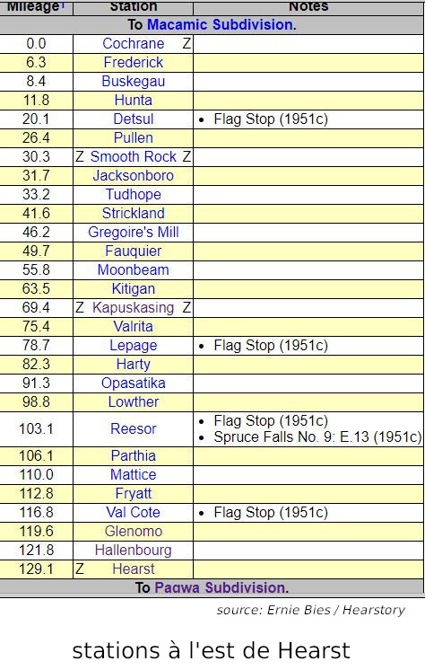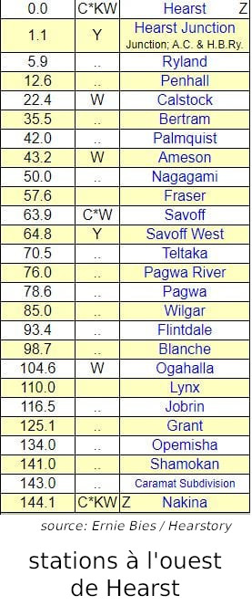 Hearst était un centre divisionaire, avec une gare principale. Tout le long du parcour, à interval régulier, de plus petites gares étaient bâties, et un arrêt du train était possible. Voici les différentes gares/arrêts, tôt après sa construction, commençant à ceux à l'ouest de la ville, jusqu'à Nakina. A noter que, en 1986 le troncon de Calstock à Nakina fut abondonné... Nous avons aussi les différents arrêts à l'est de Hearst, jusqu'à Cochrane. Hallébourg n'est pas bien écrit. Aussi que plusieurs gares, localitées, sont complètement disparues... ou ne sont que dans la mémoire de certains... Stations/localitées comme Glenomo, Fryatt, Parthia, et meme Reesor... Depuis 1993, le Ontario Northland Railway est le propriétaire de ce chemin de fer. Chacune de ses gares était des arrêts potentiels pour le train. Une gare s'y trouvait. Nous parlerons de ses gares bientôt... Un merci à Ernie Bies qui a publié les tableaux de ces arrêts dans Facebook/Hearstory en 2022.
