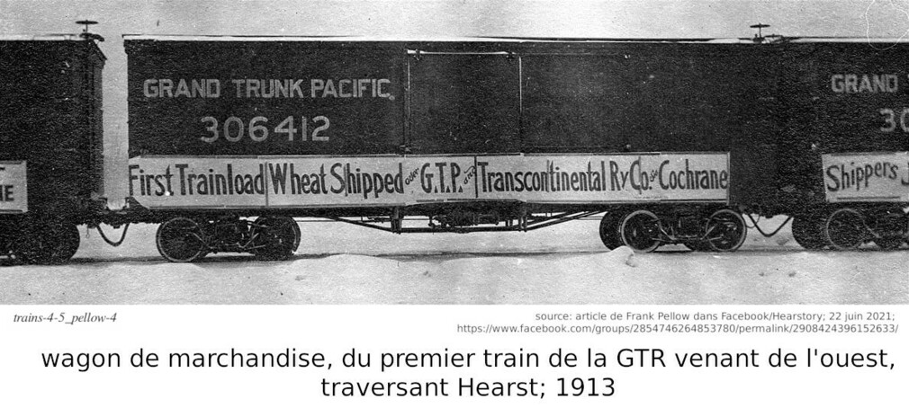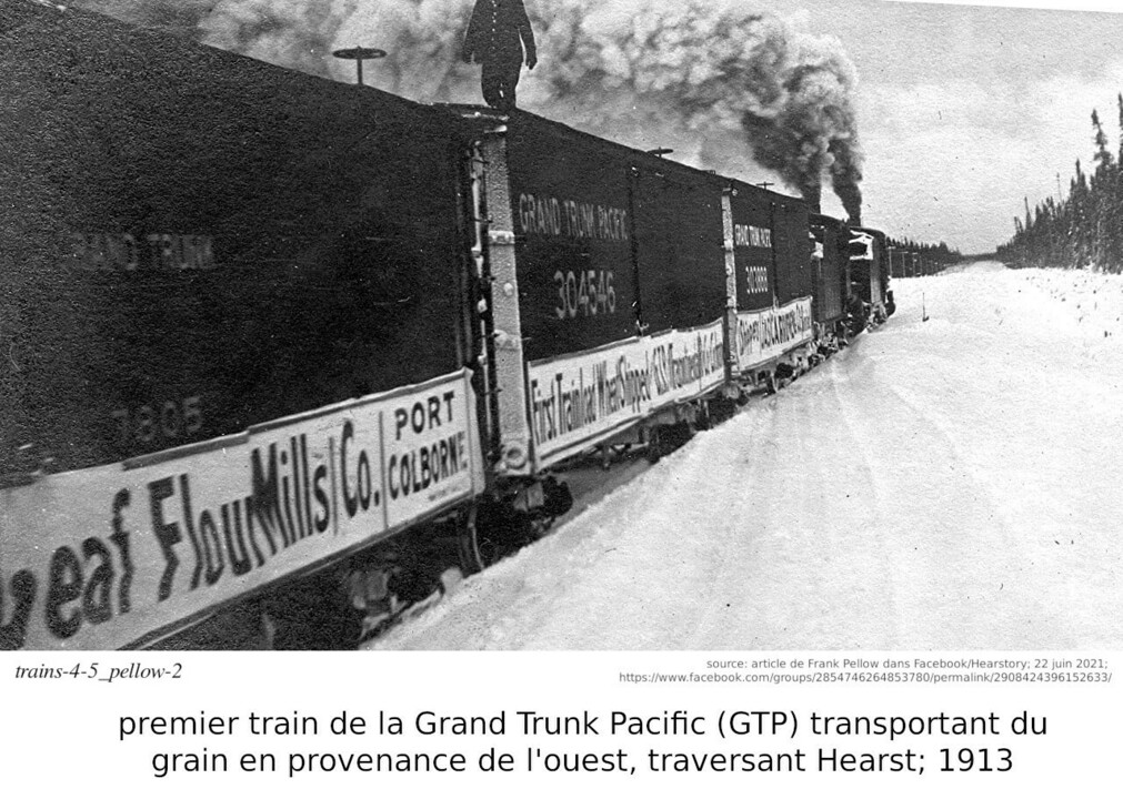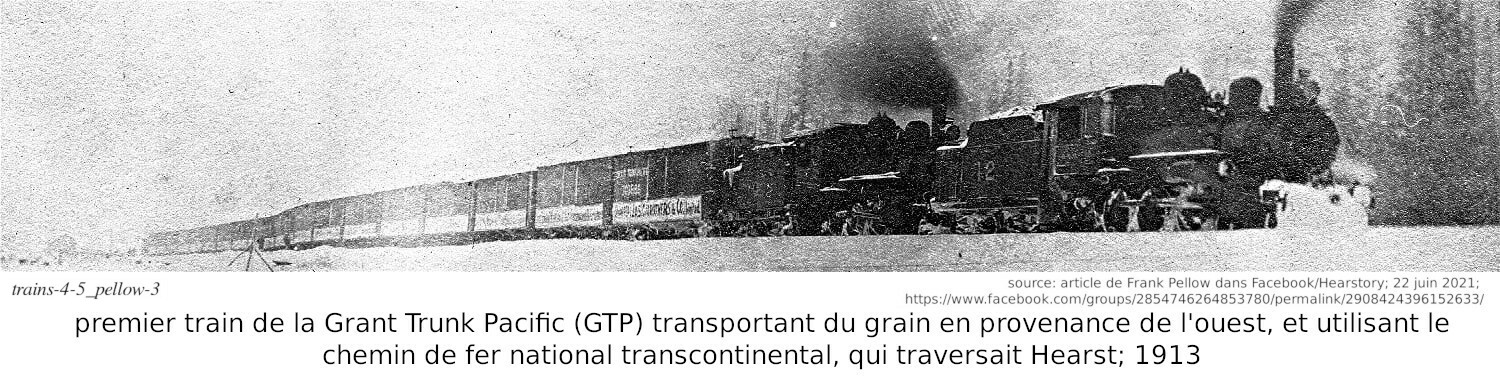 Les trois autres photos sont des photos du premier train de la Grant Trunk Railway, qui quitta l'ouest pour traverser le Canada avec un chargement de grains. Ce train utilisa le tracé du chemin de fer National Transcontinental traversant Hearst. Notez que sur une des photos, nous voyons un homme marcher sur un des wagons marchandises. Notez aussi que le train était tiré pas deux locomotives à vapeur. Dans quelques lignes, nous discuterons de la contruction du chemin de fer dans la région de Hearst. Pour appuyer cette discussion, j'utiliserai nombre de photos de l'époque. Mais d'abord, nous devons mentionner l'autre ligne de chemin de fer utilisant Hearst comme arrêt principal.