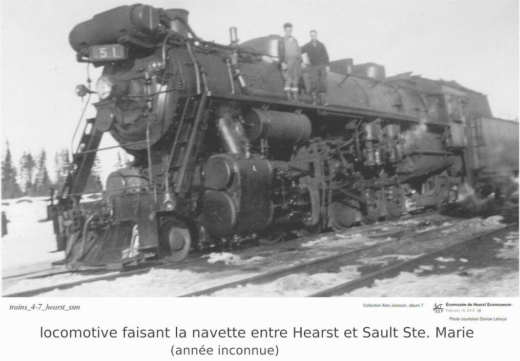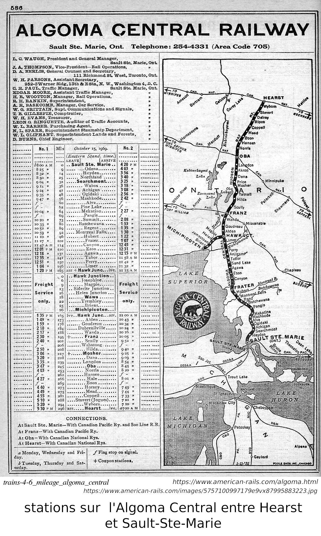 En plus des arrêts et de leurs mileage (en miles, et non en kilomètres), vous pouvez voir que le train part de Hearst à 7h00 pour arriver au Sault Ste. Marie à 16h20, et que le train du Sault Ste. Marie part à 8h00 pour arriver à Hearst à 17h30. Les deux trains se rencontrent vers la station Agawa, tout juste passé midi. On y voit aussi l'horaire du service de marchandise entre Hawk Junction et Michipicoten. Une autre resource pour l'historique du chemin de fer Algoma Central est le site https://www.american-rails.com/algoma.html.