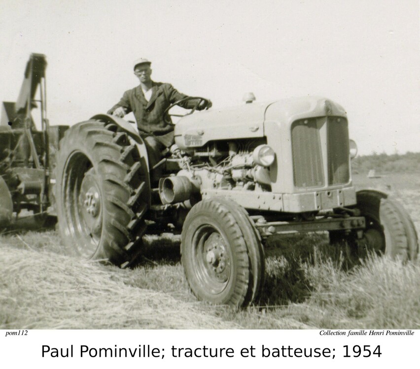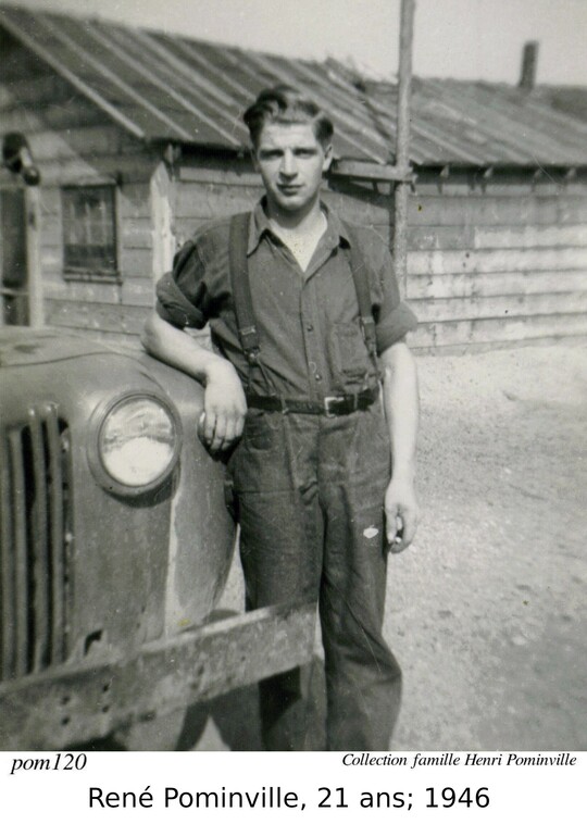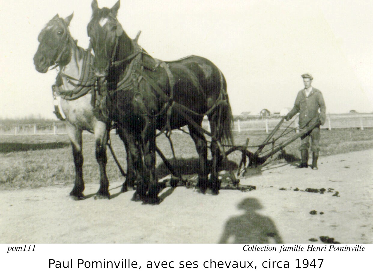 Les rations pendant la guerre n'ont pas affectées la famille Pominville d'un façon importante: la ferme fournissait tout les oeufs, la viande, le lait qu'ils avaient besoin. Pour les denrées qu'ils ne produisaient pas, comme le sucre, la famille échangeait les coupons dont elle n'avait pas besoin pour celles-ci. A son retour de l'armée, Paul continue à travailler sur la terre paternelle. Il s'achète éventuellement une terre, celle que sa famille possède encore, sur la route 11, à l'ouest du village. Nous avons deux photos de Paul travaillant la terre. Ces photos nous démontre un changement, autour des années 1950, de la façon de travailler la terre: avant les années 1950, les animaux étaient utilisés pour une grande partie des travaux agricoles. Lentement mais surement, la mécanisation a pris le dessus. Paul n'était pas exception. Paul se mari avec Noëlla Lacroix, le 24 novembre 1956, et démanage sur sa terre, où il vécu jusqu'à son décès en 2018.