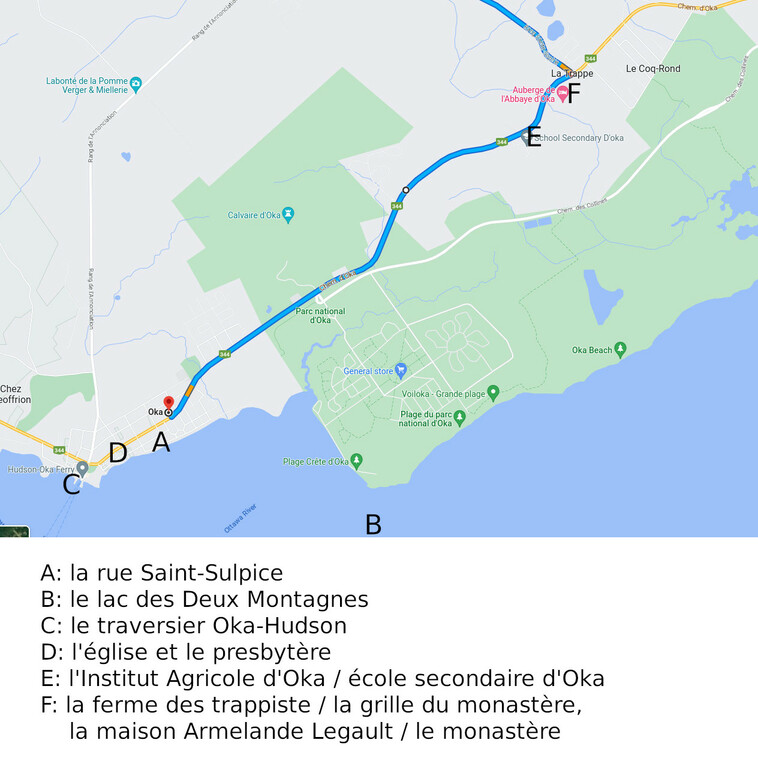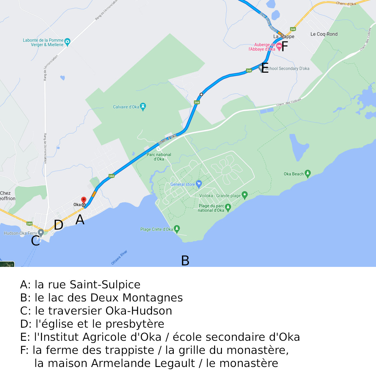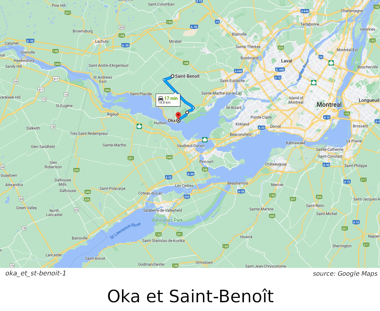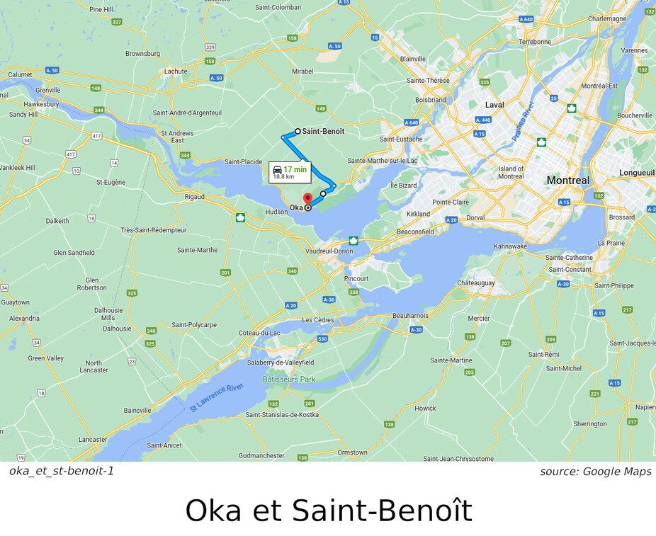 Oka et Saint-Benoit sont deux petits villages situés dans la municipalité régionale de comté de Deux-Montagnes, sur les rives du lac des Deux Montagne, immédiatement à l'est de l'Ile de Montréal, sur le Saint-Laurent. Pour vous aider à vous situer, j'ai enclu une carte, issue de Google Maps, démontrant le trajet à prendre, en voiture, du village d'Oka, à celui de Saint-Benoît. En cliquant sur cette carte, vous y verrez beaucoup de détails de la région: à l'est est la grande ville de Montréal. Vous y remarquerez aussi plusieurs municipalités mentionées dans la section précédente: Laval (Ile de Jésus), Blainville, Sainte-Thérèse, Saint-Eustache. Oka est sur le Lac des Deux Montagnes, où la rivière des Outaouais (Ottawa River) se déverse. Le Lac des Deux-Montagnes se déverse dans le fleuve Saint-Laurent, qui lui se déverse dans l'océan Atlantique...