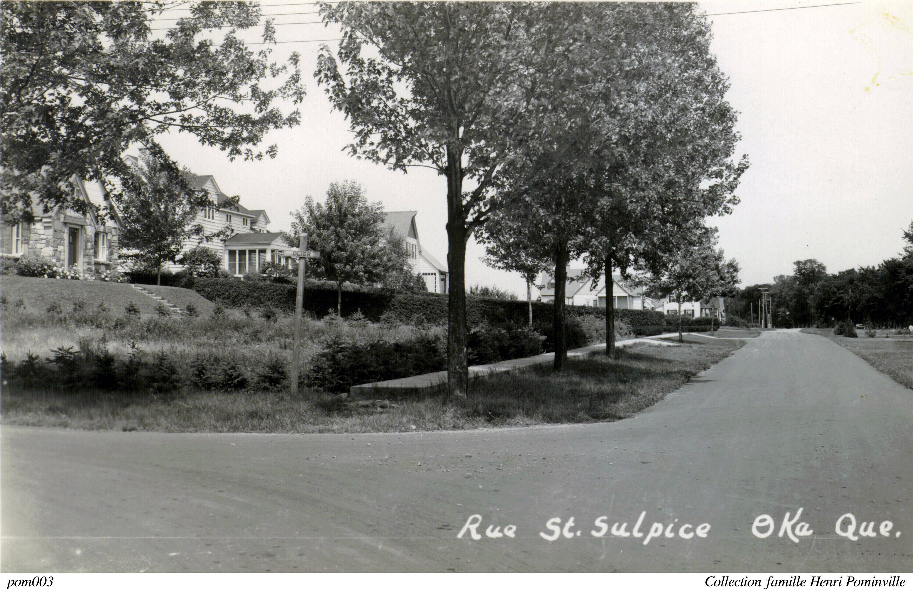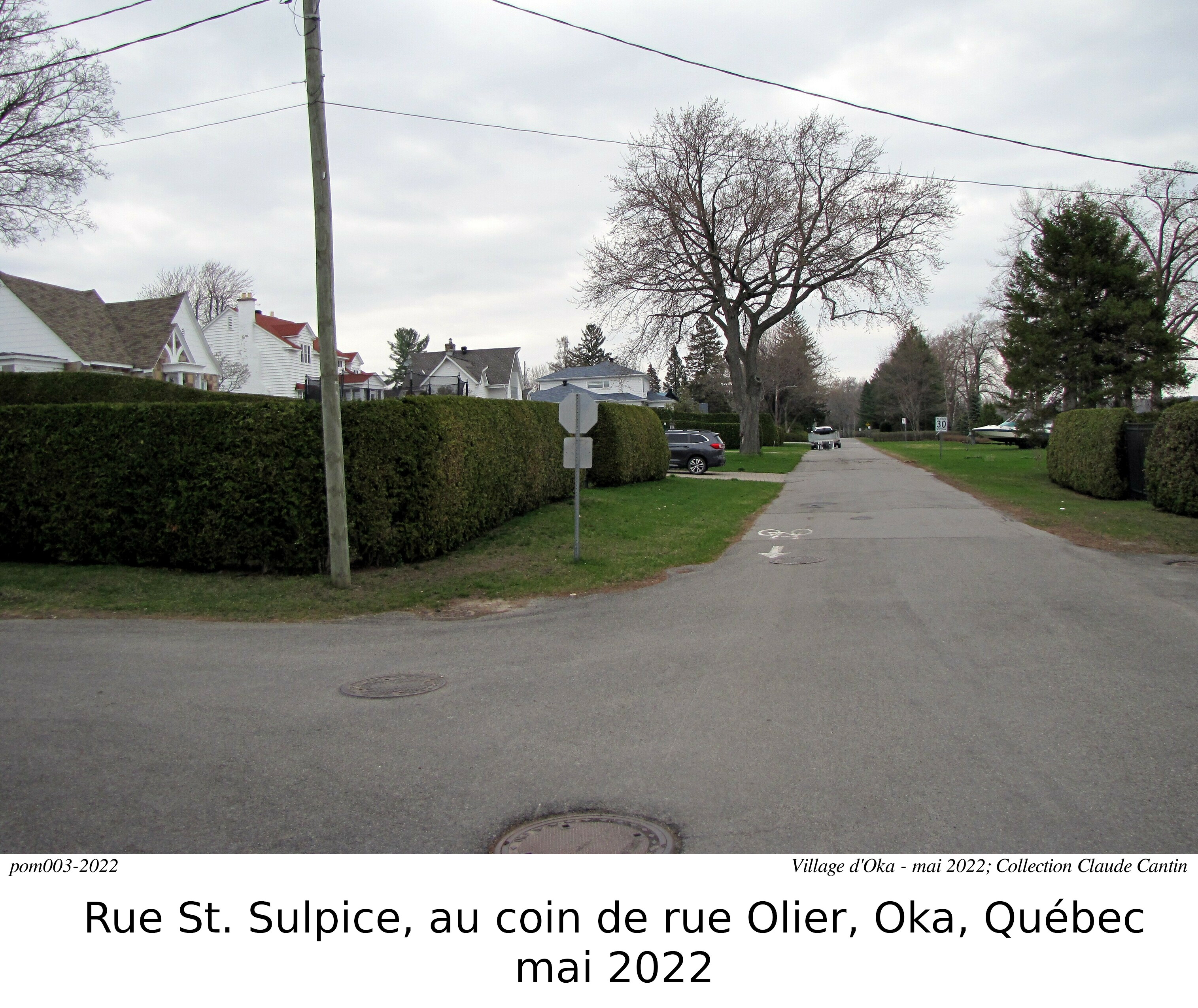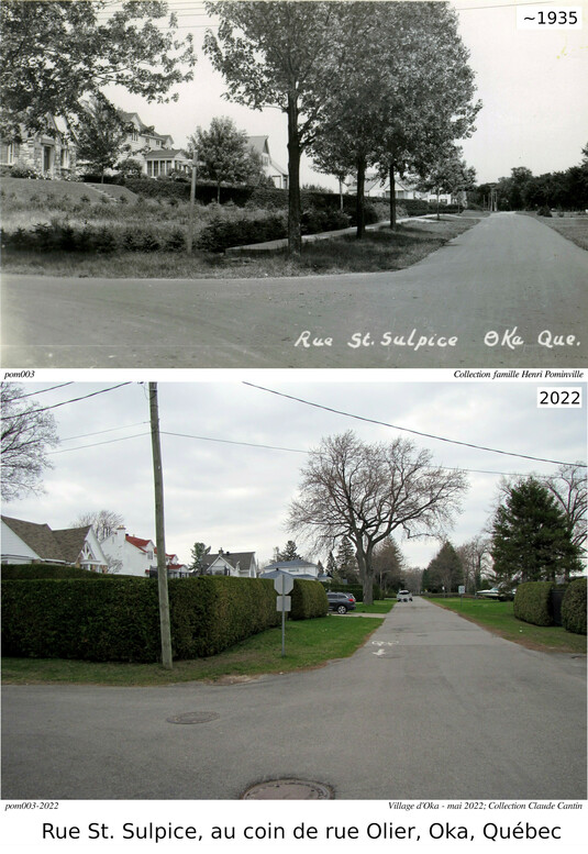 La rue Saint-Sulpice. (1935, 2022); Naturellement, après près de 80 ans, les zone résidentielles changent. Les arbres grandissent (ou disparaissent); les haies "poussent"; les poteaux de téléphone (ou d'hydro) apparaissent. Mais si nous regardons attentivement, certaines choses sont les mêmes. Comme cette maison avec le pignon avant "en forme de bec". Le charactère de la rue semble être le même; le trotoire fut enlevé, mais la rue reste la même largeur. Nous ne le voyons pas sur la photo, mais cette rue longe le lac des Deux Montagnes. Il n'y a pas de maison sur le côté "droit" de la rue: il y a de la verdure, puis le lac des Deux Montagnes. J'imagine que jadis, il y avait des maisons, mais que, dû aux inondations, elles furent toutes démolies. C'est une rue tranquille, à l'est de l'église, du presbytère, et de l'hôtel de ville. C'est un cul-de-sac.