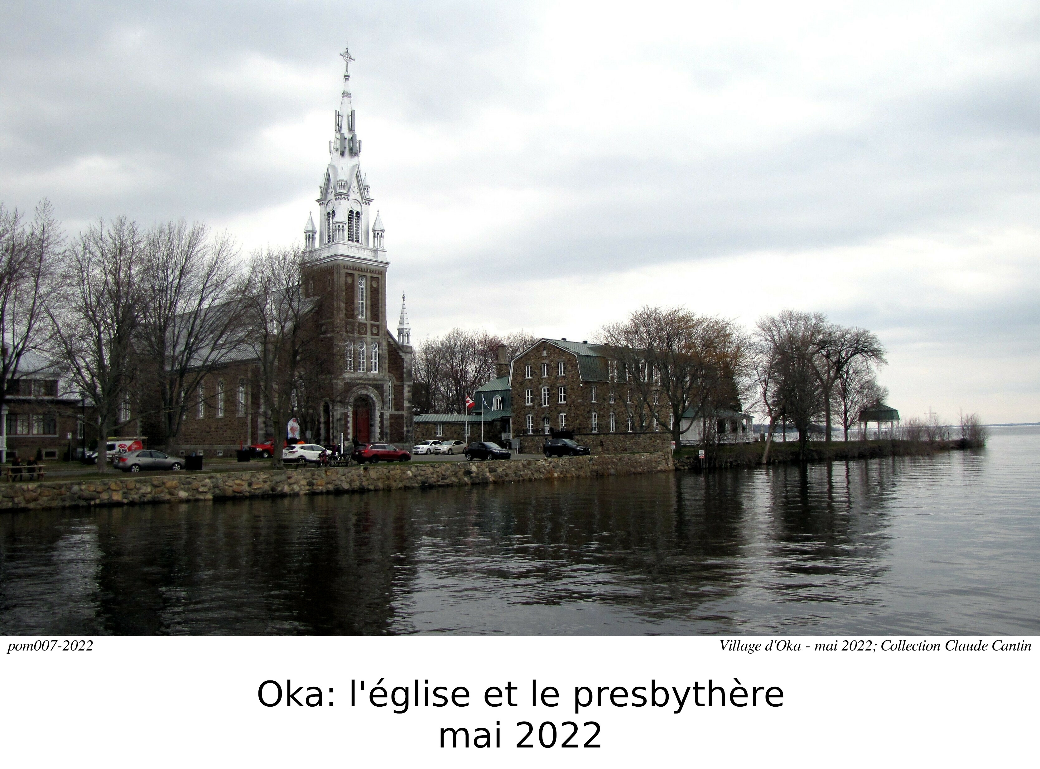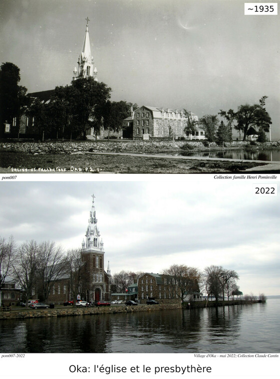 Eglise et presbytère de L'Annonciation d'Oka (1935, 2022); Mon grand-père avait deux cartes postales concernant l'église et le presbytère. J'en reproduit ici seulement une, celle prise du quai municipal. En 1721, la première église est construite par les Sulpiciens et les Amérindiens; en 1819, un clocher de bois comprenand deux cloches, est ajouté. L'église et le presbytère brûlent en 1877; reconstruction en pierre débute deux ans plus tard, et dure 4 ans (1879-1883). Le clocher est achevé en 1907. Le presbytère brûle de nouveau en 1923, pour être reconstruit encore une fois (mais raccourci de 10,5 mètres côté est). C'est celui que nous voyons dans les photos, et qui existe encore. Aujourd'hui, le presbytère sert de maison de repos aux Sulpiciens Note: l'information historique fut recueilli via les plaques historiques de l'endroit.
