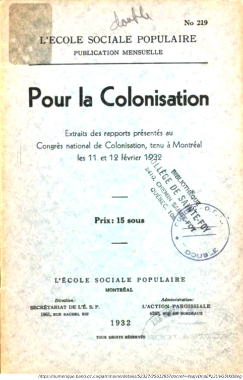 En 1932, un "Congrès national de Colonisation" était tenu à Montréal. Le but de ce congrès était de démontrer que la colonisation "canadienne" (i.e. catholique française) était nécessaire pour la survie de "sa race" (expression ouverte à interprétation, selon le contexte des années 30)...