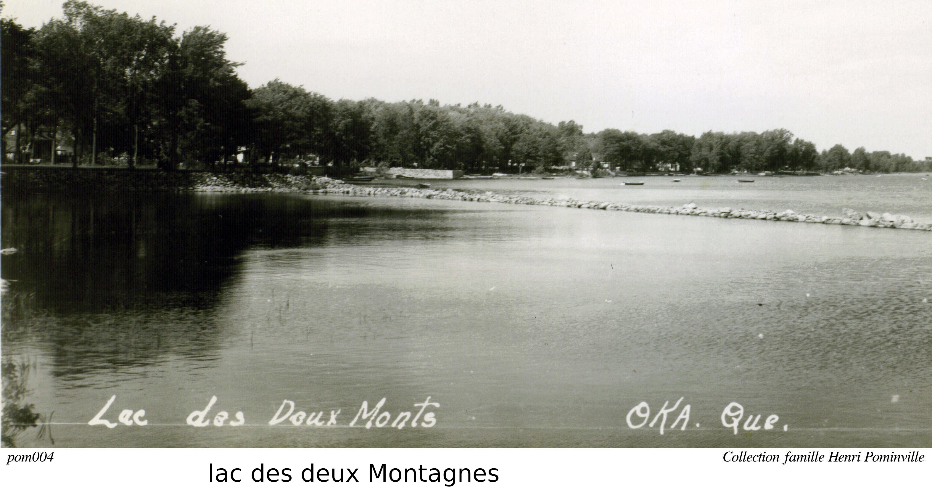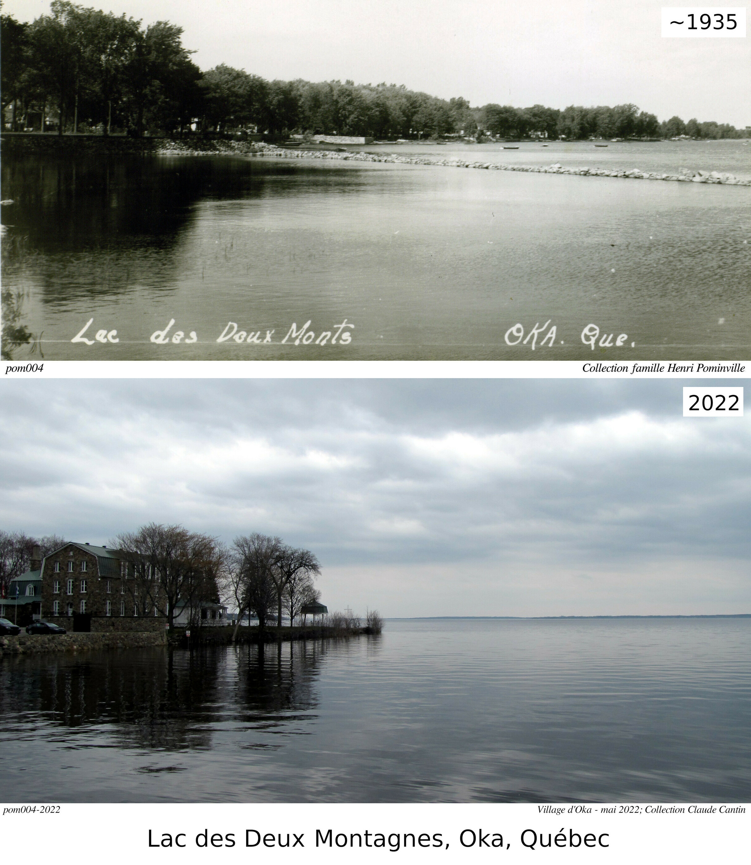 Le lac des Deux Montagnes (1935, 2022); C'est difficile à dire exactement d'où la photo pour la carte postale originale fut prise. Si j'avais à deviner, je dirai que c'est soit du quai municipale, ou d'une jetée en face de l'église. Il n'y a plus de jetée en face de l'église, alors j'ai pris une photo du quai municipale, regardant vers l'est. Le lac des Deux Montagnes est un élargissement de la rivière des Outaouais, lorsque celui-ci ce jette dans le fleuve St-Laurent. Le lac est au sud de l'archipel d'Hochelaga, un groupe de 320 iles incluant l'Ile de Montréal (ville de Montréal) et l'Ile Jésus (Laval). Ce lac est de 43 km de long, et sa largeur est de plus ou moins 10 km, selon l'endroit. Si vous prenez l'autoroute entre Ottawa et Montréal (417 en Ontario; 40 du côté du Québec) le grand pont entre Vaudreuil et l'Ile de Montréal est le pont de L'île Aux Tourtes. Au nord de ce pont, c'est le lac des Deux Montagnes; au sud, le fleuve Saint Laurent (certains pourraient dire que c'est une baie du lac des Deux Montagnes dans le Saint Laurent; ils pourraient avoir raison...). Lorsque je traverse ce pont, ça me donne l'impression que j'arrive à Montréal (ou que je quitte le grand Montréal).