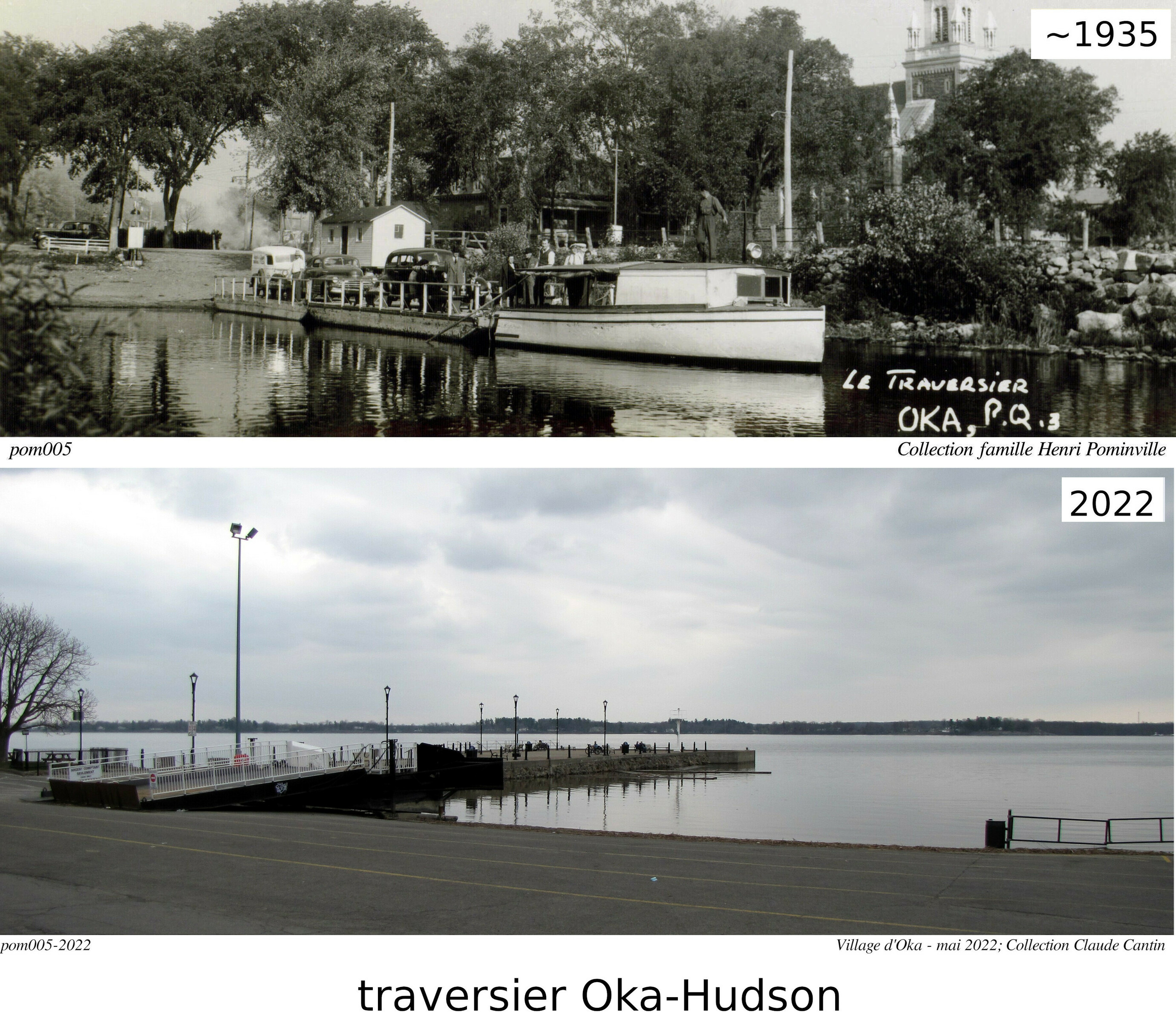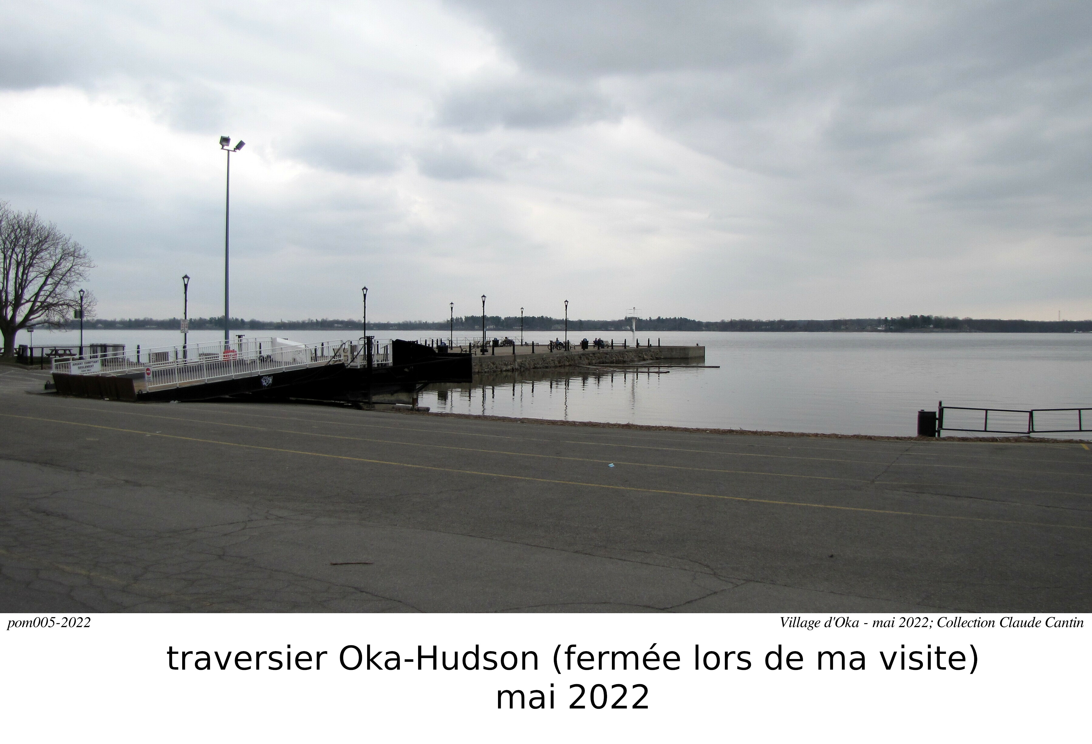 Le traversier Oka-Hudson (1935, 2022); il est situé tout juste à côté de l'église, près du qui municipal. Malheureusement, lors de ma visite en mai 2022, il était fermé. Plusieurs des mesures spéciales concernant la COVID-19 étaient encore de vigueur... c'est peut-être la raison. Comme nous pouvons voir sur la photo de 2022, l'embarquadaire était en place. Il ne restait que le poussez un peu plus vers l'eau, et d'y amener le traversier... Ce service de traverse entre Oka et Hudson existe depuis 1909. La distance entre Oka et Hudson est de 2 km, et prend une dizaine de minutes à franchir. Wikipédia me dit que, si les conditions sont bonnes, un pont de glace est mis en place l'hiver.