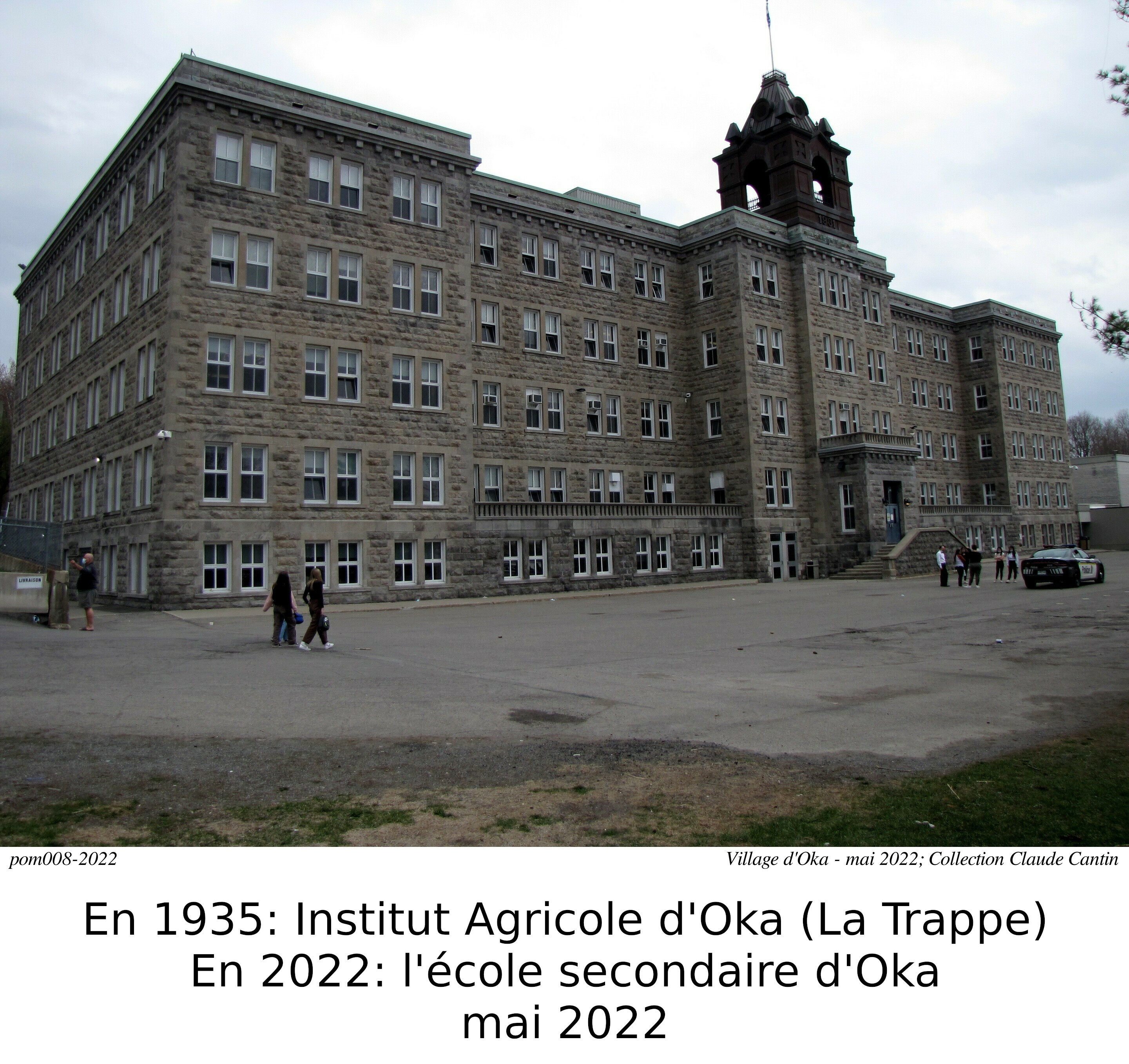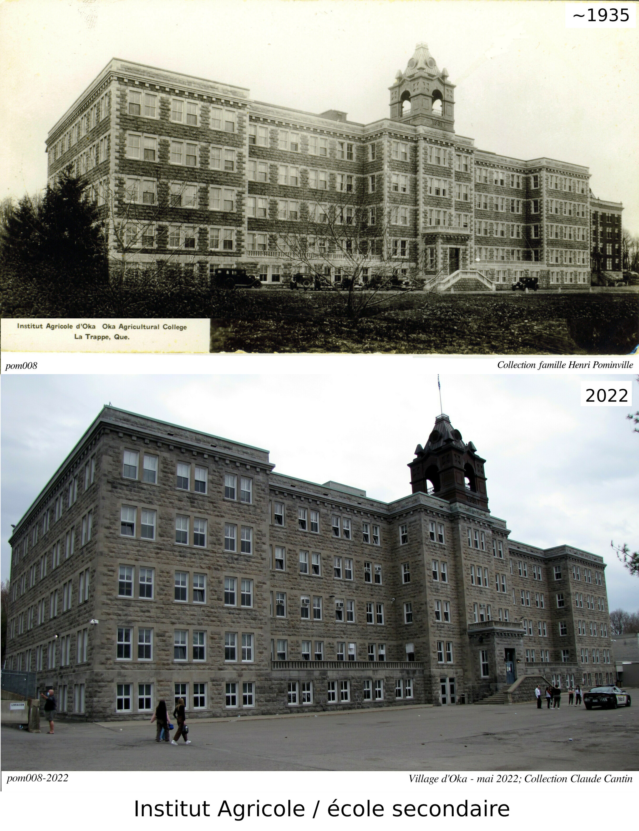 L'Institut Agricole... aujourd'hui école secondaire! (1935, 2022); L'école d'agriculture d'Oka fut construite en 1930 par les trappiste. Peu après sa construction, elle inclue aussi une école de médecine vétérinaire. Vers les années 1960, elle est transformée en un collège privé géré par les pères de la Consolata. Au début des années 1970, la commission scolaire locale achète l'édifice, la propriété, et la transforme en école secondaire. (Information receuillie sur la page wikipédia de l'école secondaire d'Oka) Encore aujourd'hui, l'agriculture est importante pour cette région.