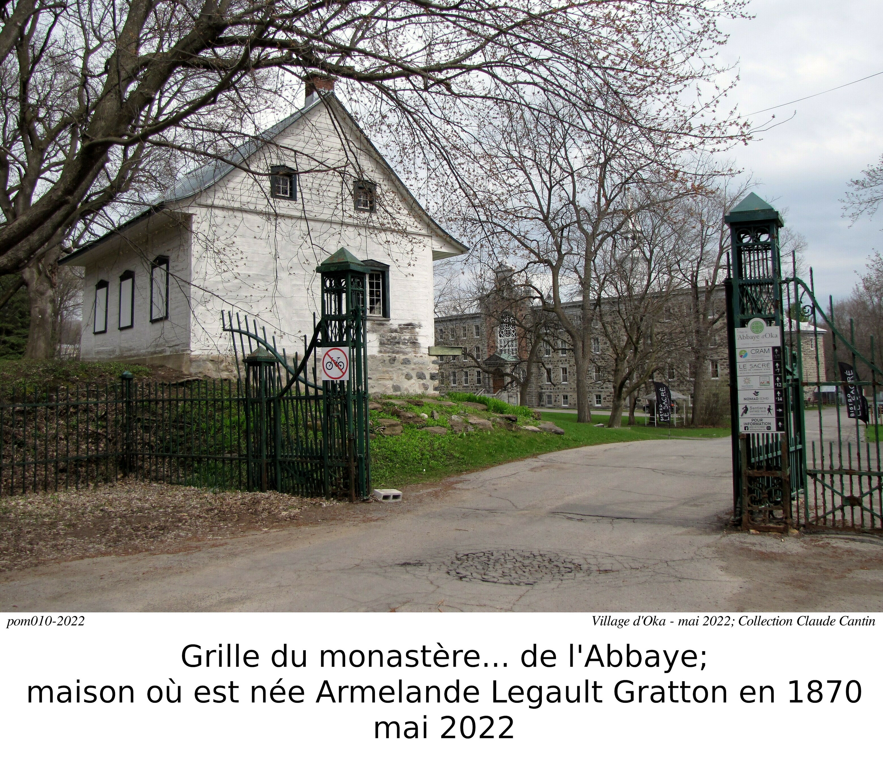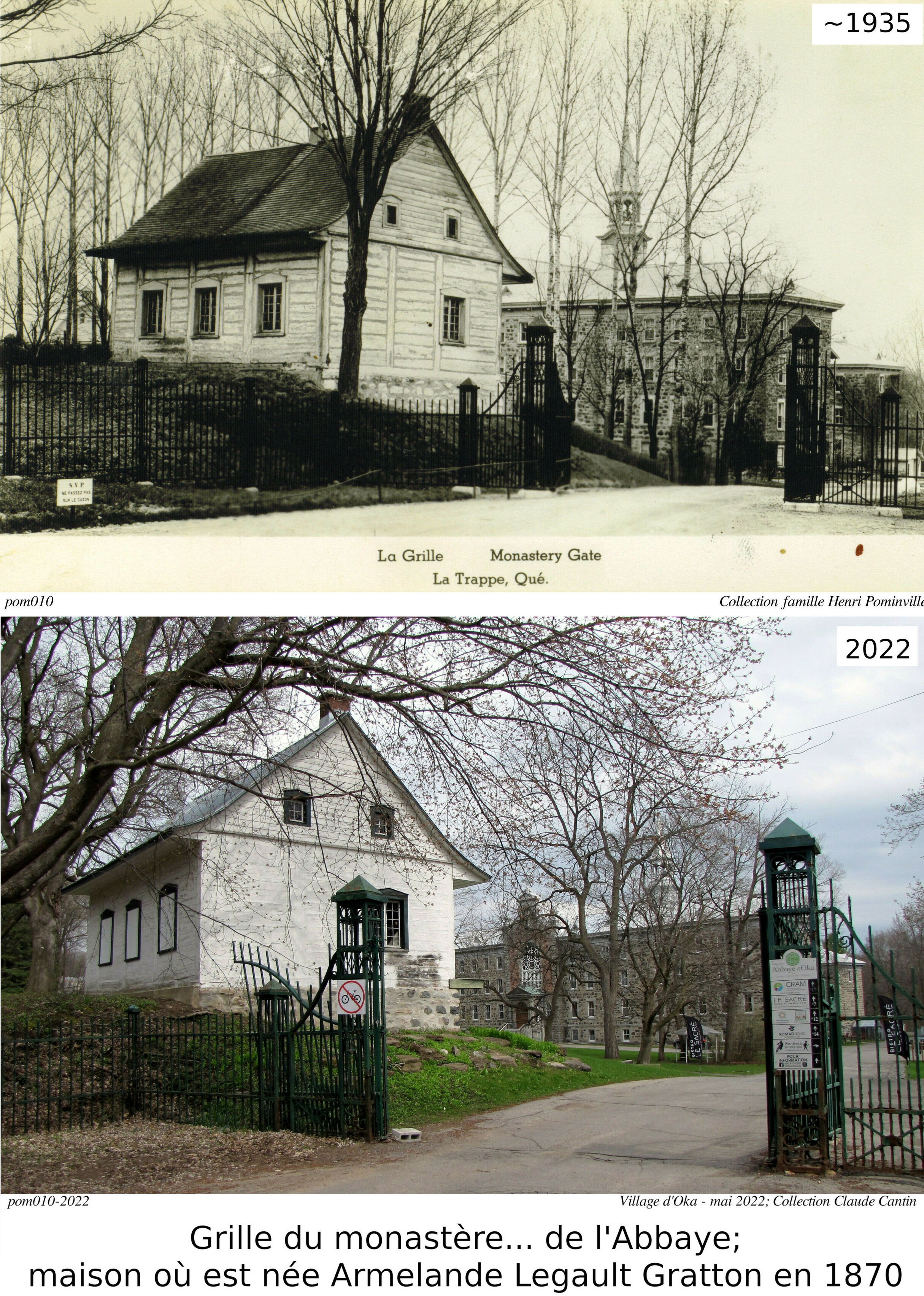 La grille du Monastère (1935, 2022). Cette photo devrait représenter l'entrée du monastère des trappistes. C'est vrai pour la plupart des gens. Mais pour ma famille, elle représente beaucoup plus: c'est celle de la maison où mon arrière-grand-mère, Armelande Legault, est née, en 1870! Armelande Legault était marié à Paul Gratton, le père de Béatrice Gratton, ma grand mère maternelle. La propriété des Legault fut achetée par les trappiste, qui sont venu de France pour s'y établir, et fondée l'école d'Agriculture d'Oka. La propriété des trappiste était connu sous le nom de La Trappe... d'où le nom de La Trappe d'aujourd'hui. Heureusement, la maison de mon arrière-grand-mère est préservée. Les personnes qui travaillent à la réception de l'auberge ont même un nom spécifique pour cette maison: elle me l'ont dit, mais je ne l'ai pas écrit, et l'ai oublié... :-( Lorsque j'y suis allé en 2022, je n'avais pas réalisé que le fromage d'Oka, le monastère, les fermes, le magasin de l'Abbaye, l'Institut Agricole (aujourd'hui une école secondaire) étaient tous directement relié à cette organisme religieux...