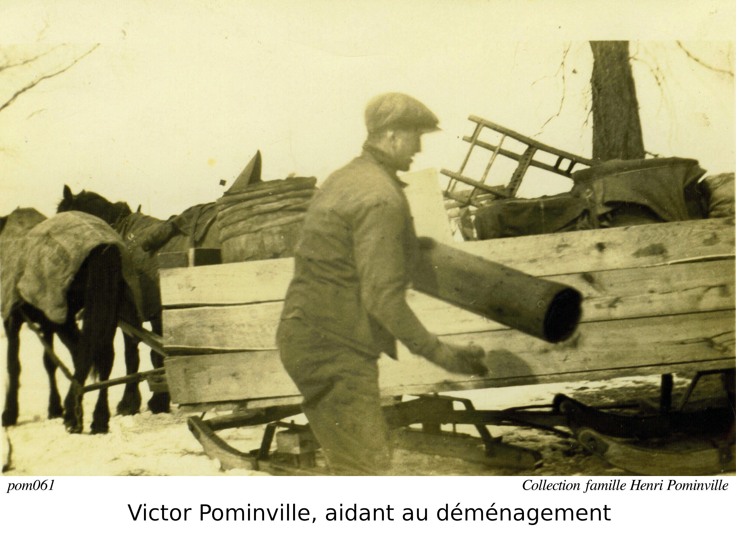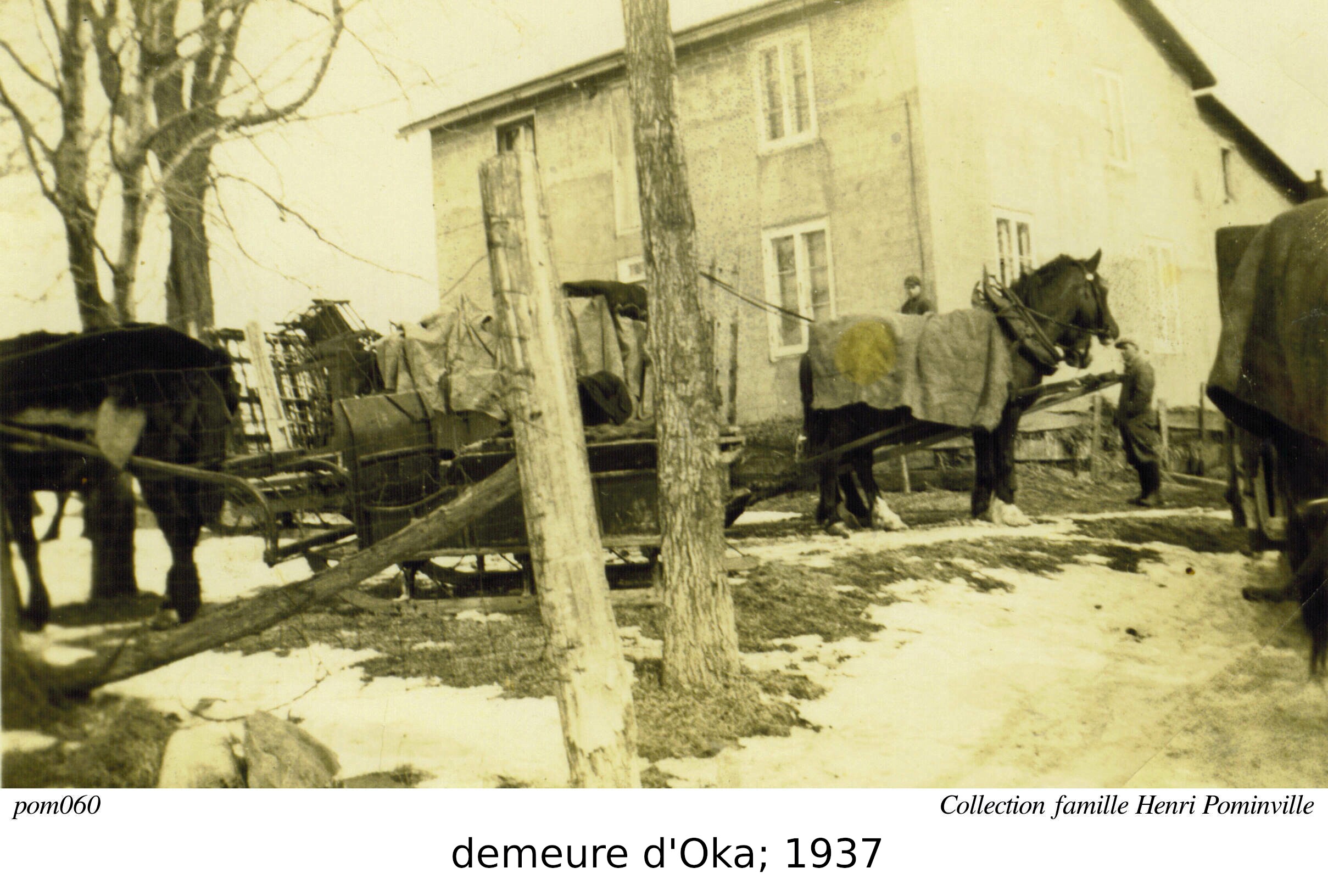 Après l'encan, le déménagement. Il se fit le 19 mars, 1937. Le trajet d'Oka - St. Eustache s'est fait en traîneau tiré par chevaux, avec Arthur Lanthier (beau-frère d'Henri). François Pominville (frère d'Henri) est venu chercher les enfants en camion pour les conduire à la gare de Montréal. Il n'y avait pas de chemin déblayé entre Oka et St. Eustache, dont l'utilisation du traineau était nécessaire.